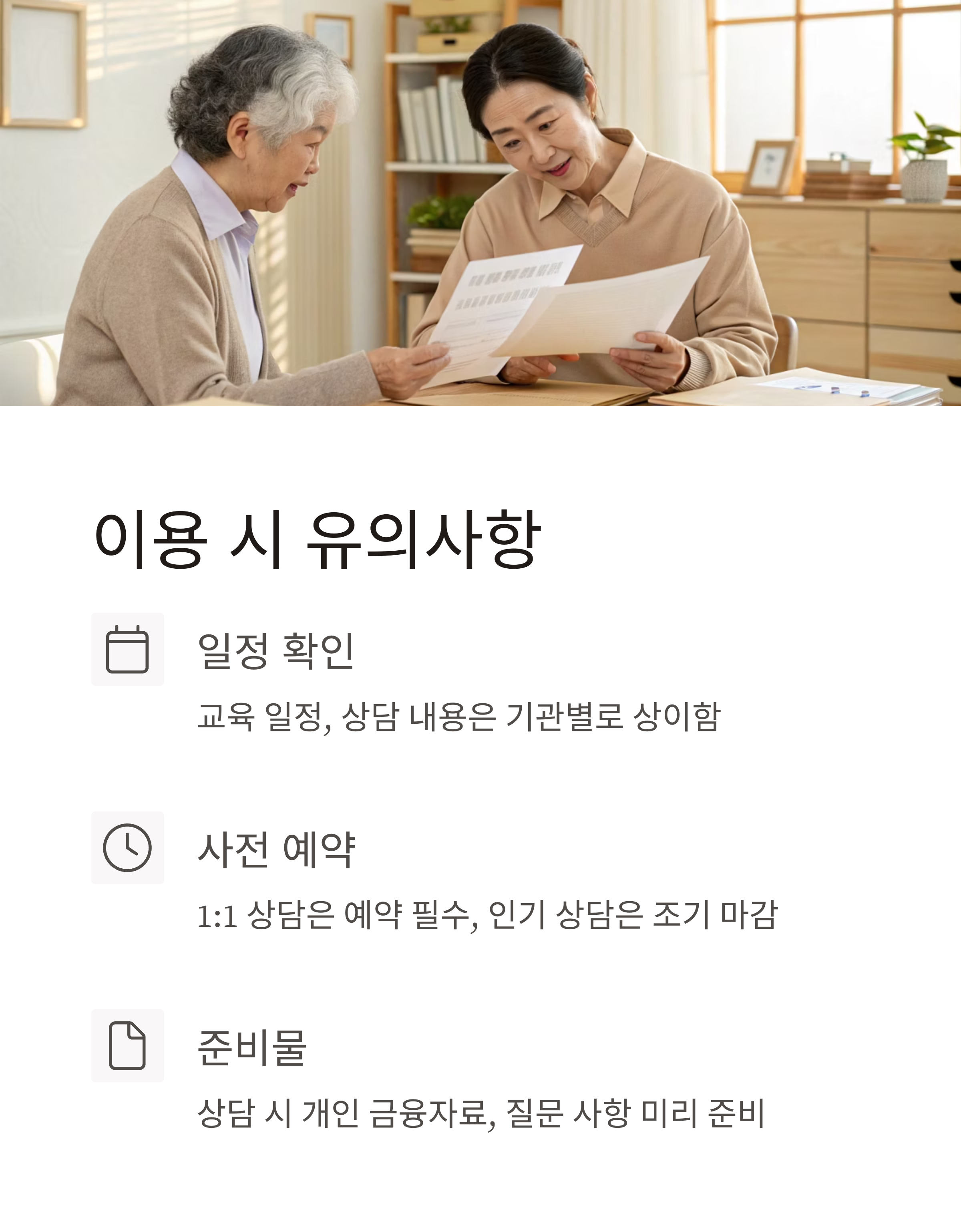 - 금융감독원 파인, 시니어금융교육협의회, 각 금융기관 홈페이지, 콜센터(예: 1688-8114) 등에서 온라인·전화 접수