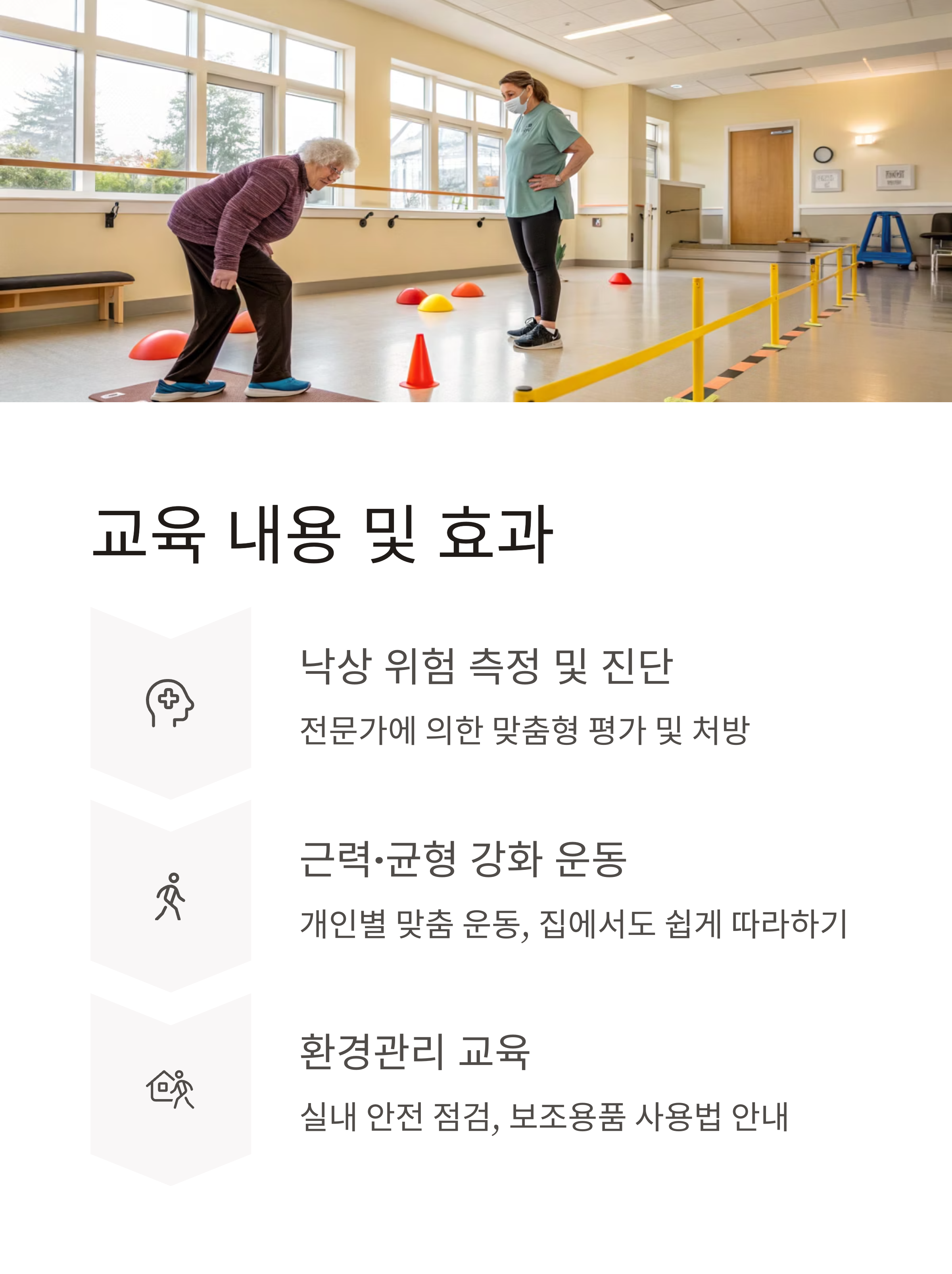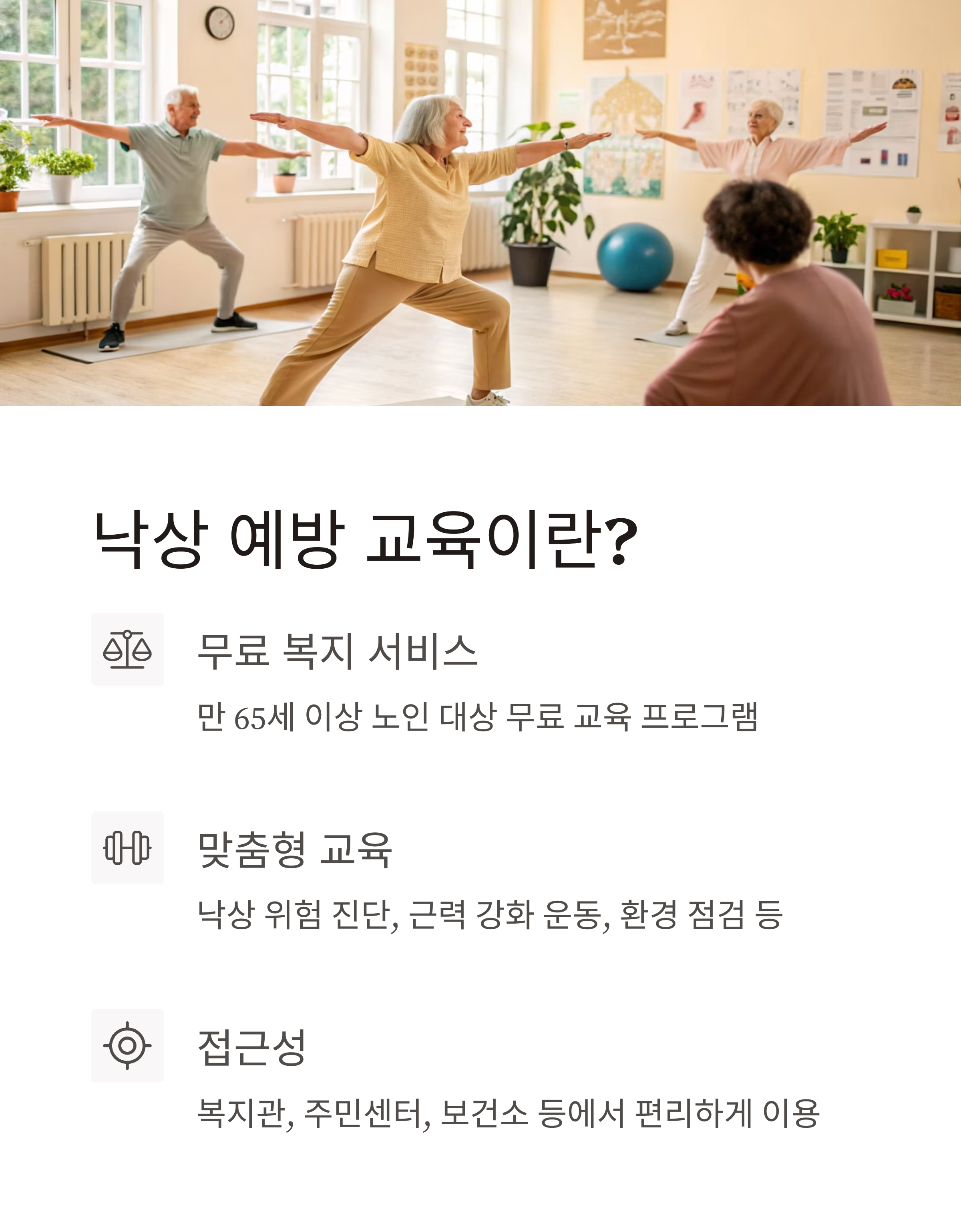 만 65세 이상 노인을 대상으로, 복지관·주민센터·보건소 등에서 낙상 위험 진단, 근력 및 균형 강화 운동, 환경 위험요인 점검, 실내 안전관리 등 낙상 예방에 필요한 이론과 실습 교육을 무료로 제공하는 복지 서비스입니다. 질병관리청 등에서는 운동 동영상, 실내 환경 점검표, 전문가 양성 프로그램 등도 함께 개발·보급하고 있습니다.