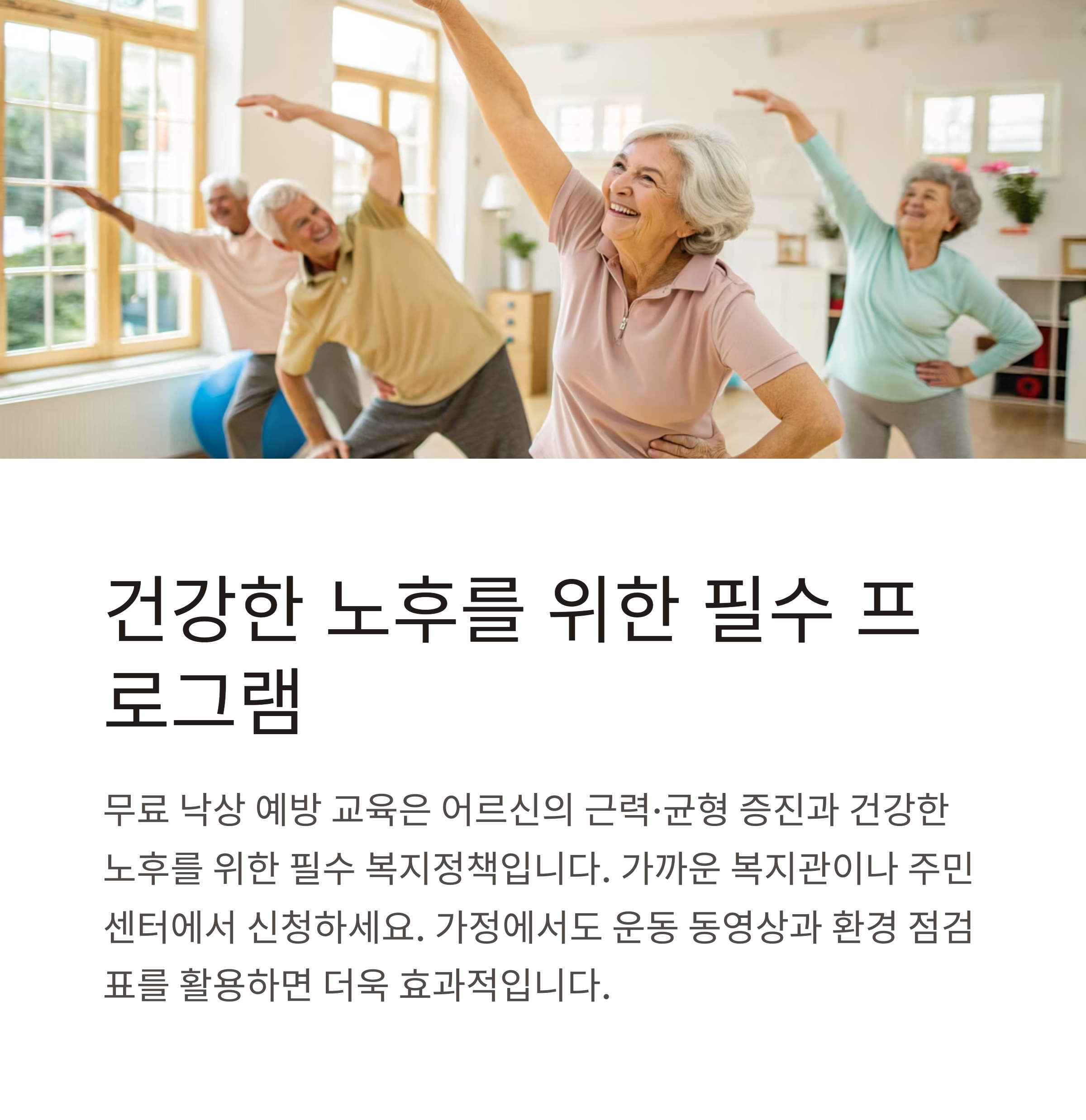 무료 낙상 예방 교육은 어르신의 근력·균형 증진과 건강한 노후, 반복 입원 예방에 꼭 필요한 복지정책입니다. 가까운 복지관, 주민센터, 복지로 홈페이지에서 신청할 수 있으니, 교육 일정과 내용을 꼭 확인하고 적극적으로 참여해보세요. 가정에서도 운동 동영상과 환경 점검표를 활용하면 더욱 효과적입니다.