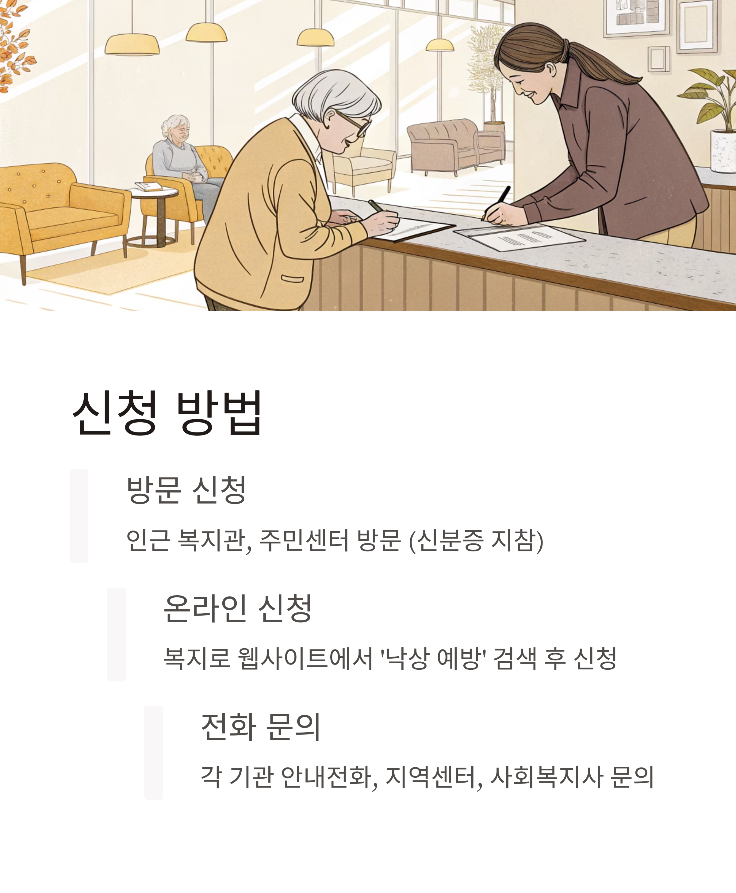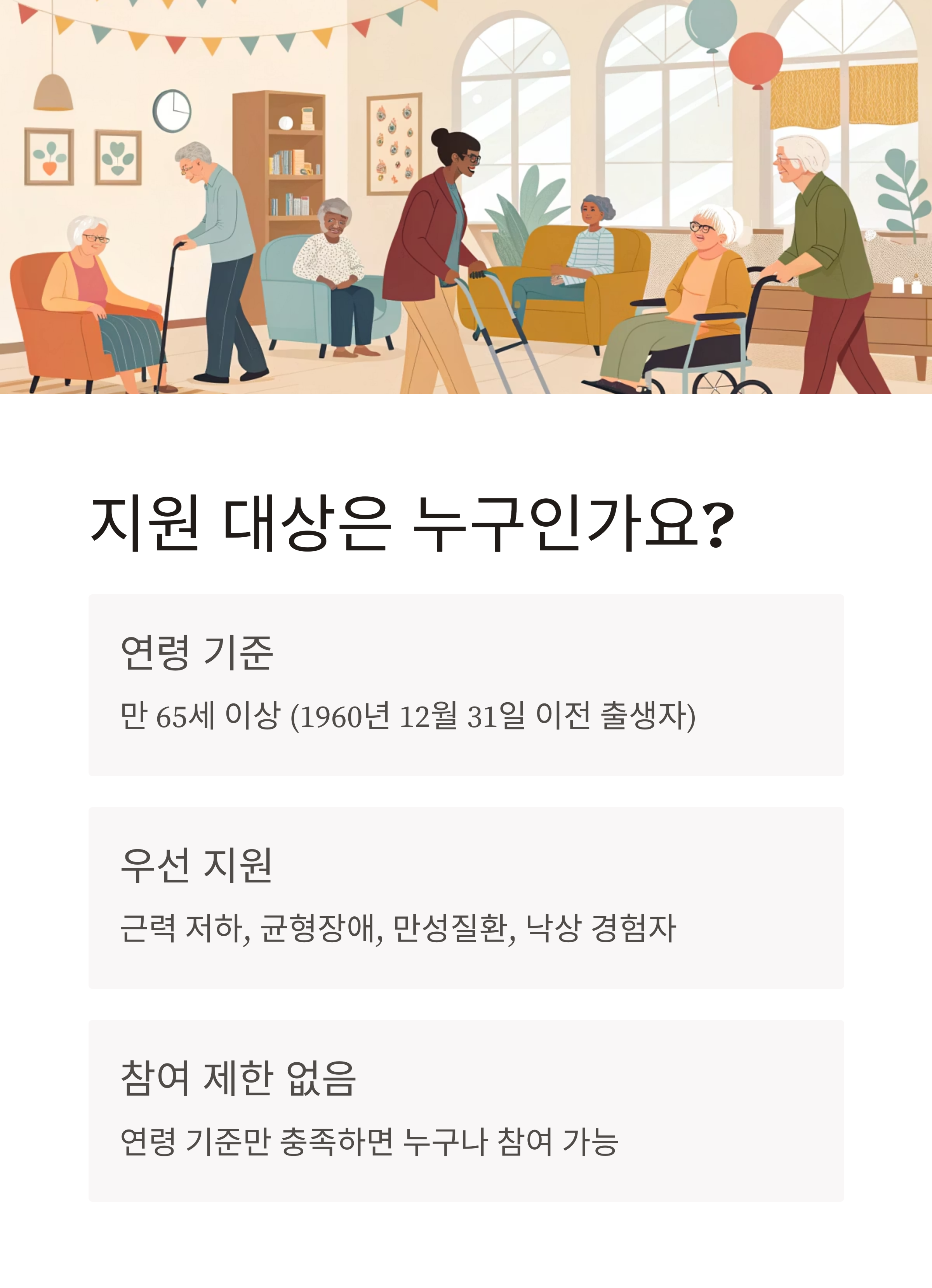 - 낙상 위험군: 근력 저하, 균형장애, 만성질환, 낙상 경험자 등 우선 지원