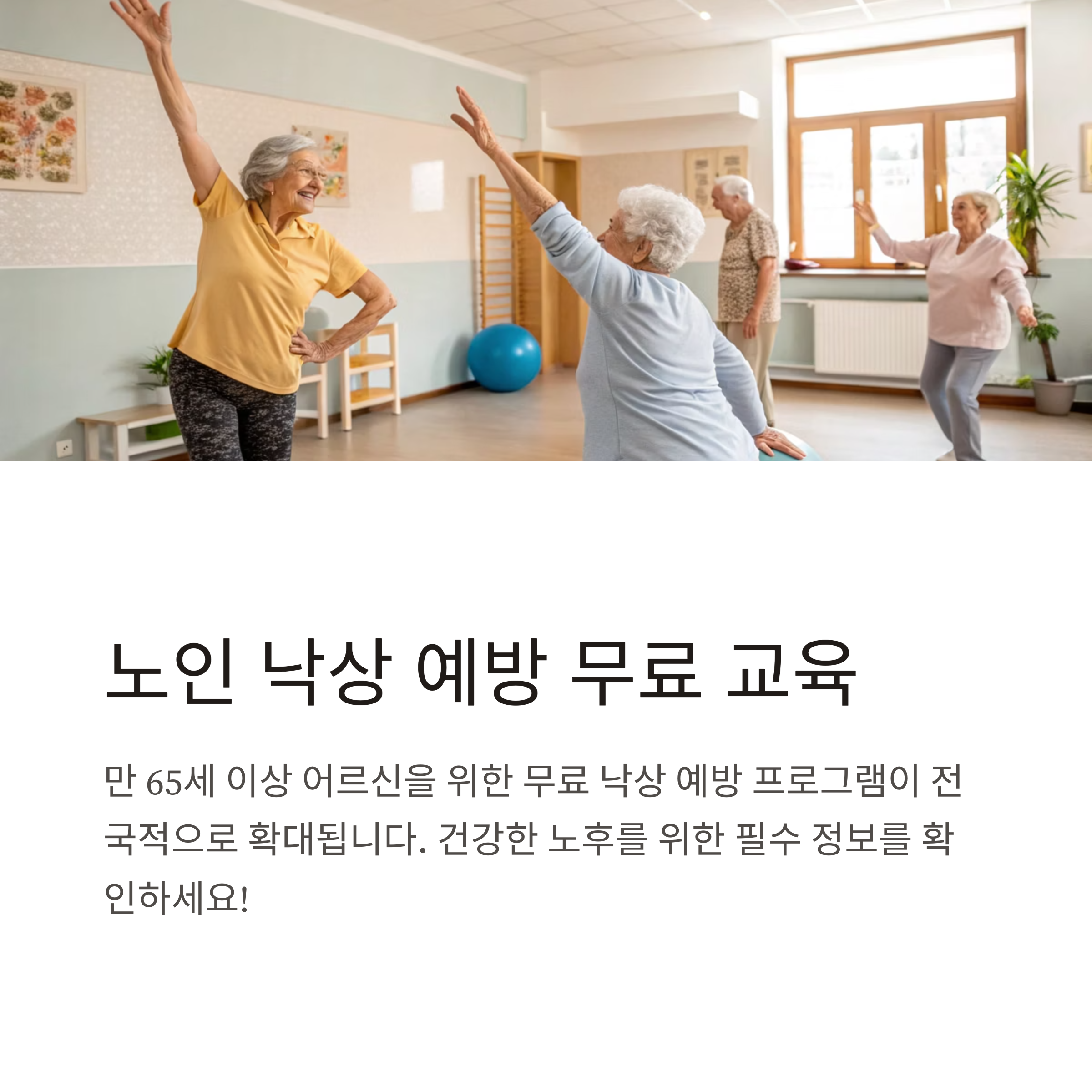 노인 낙상은 신체적·정신적 건강에 큰 영향을 미치며, 장기간 요양과 반복 입원의 주요 원인입니다. 정부와 지자체, 복지기관에서는 만 65세 이상 어르신을 위해 무료 낙상 예방 교육과 운동 프로그램을 전국적으로 확대 운영하고 있습니다. 2025년에는 체계적인 운동 교육, 환경 개선, 전문가 양성 등 다양한 맞춤형 프로그램이 제공되어 누구나 쉽게 참여할 수 있습니다. 아래에서 지원대상, 주요 교육 내용, 신청 방법, 주의사항 등 꼭 필요한 정보를 꼼꼼하게 안내합니다.