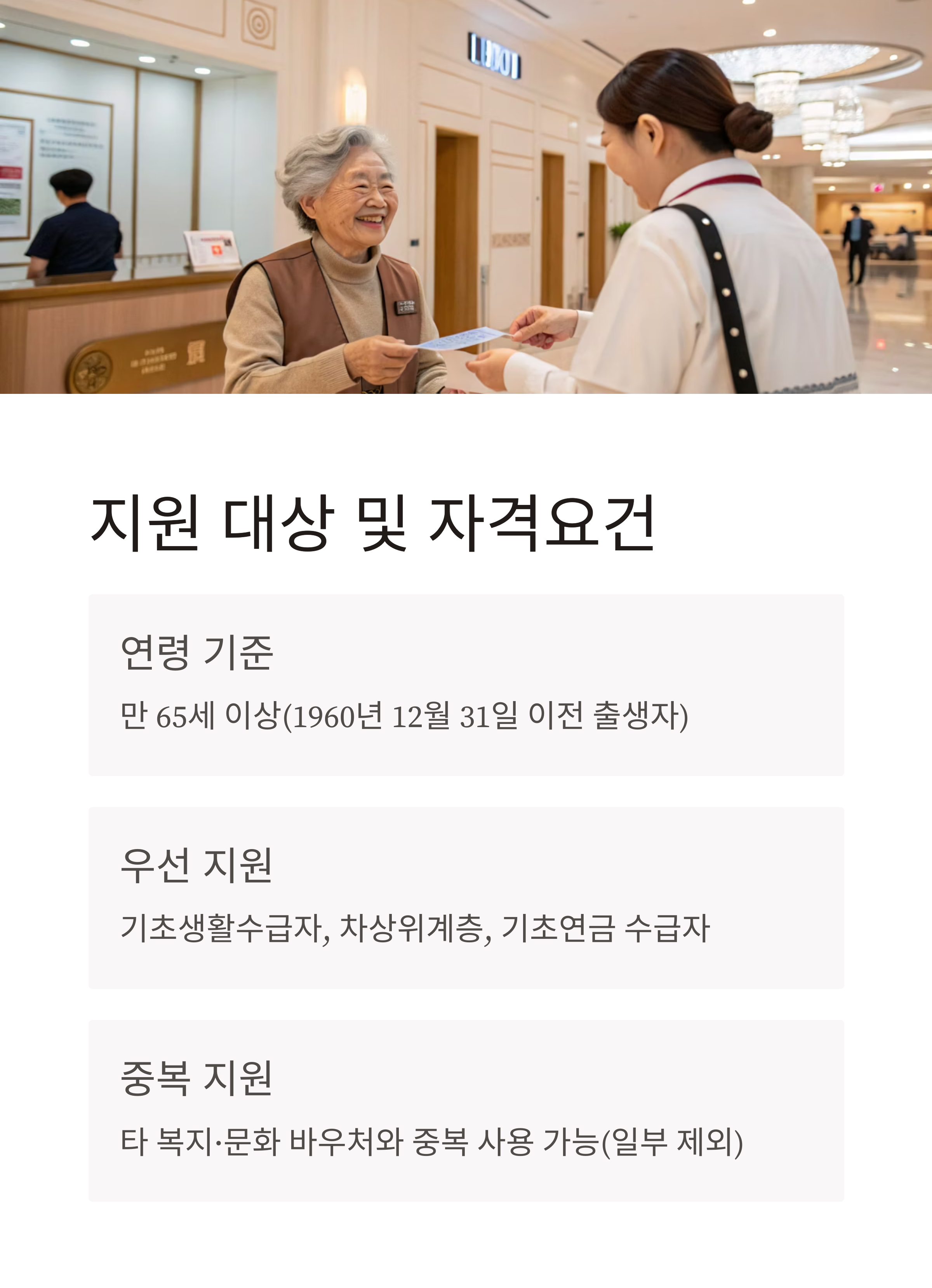 - 중복 지원: 타 복지·문화 바우처와 중복 사용 가능(일부 프로그램 제외)
