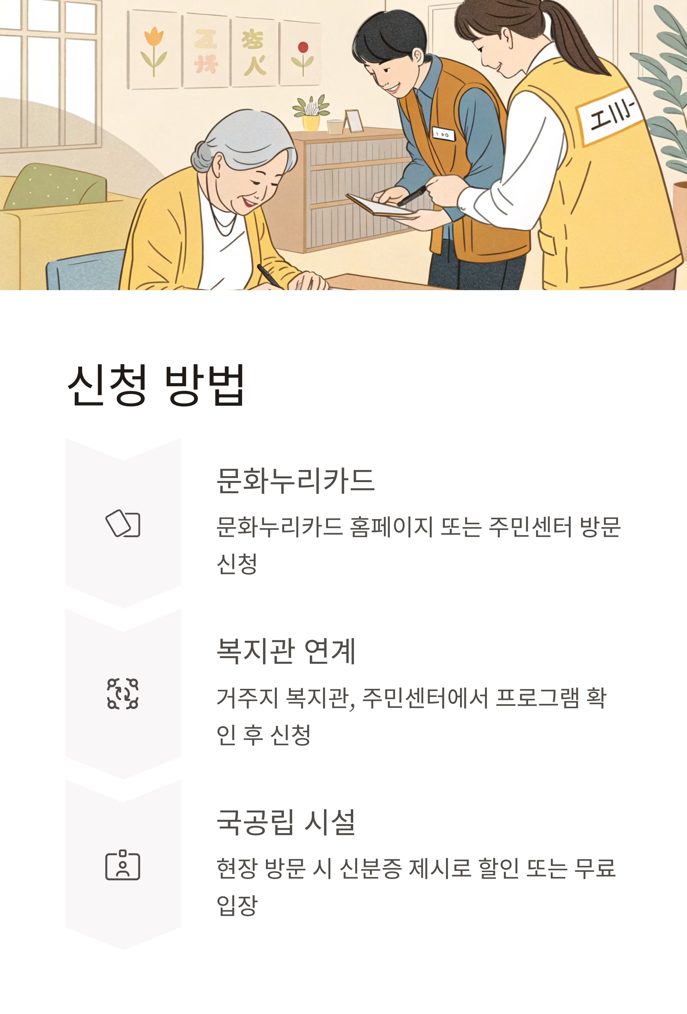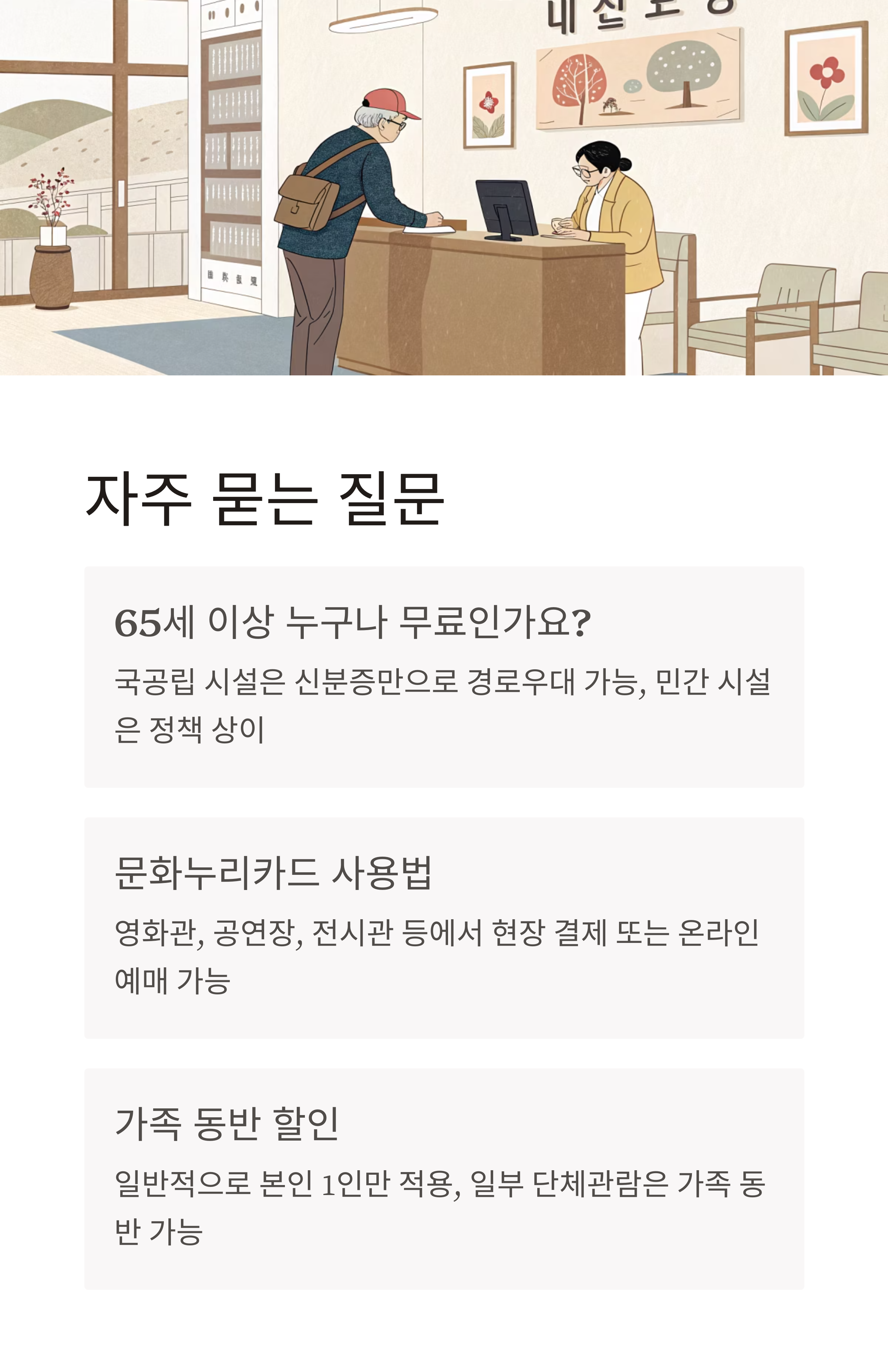 국공립 시설은 신분증만 있으면 경로우대 할인 또는 무료 입장이 가능합니다. 민간 영화관·공연장은 각사 정책에 따라 상이합니다. - Q. 문화누리카드는 어떻게 사용하나요?