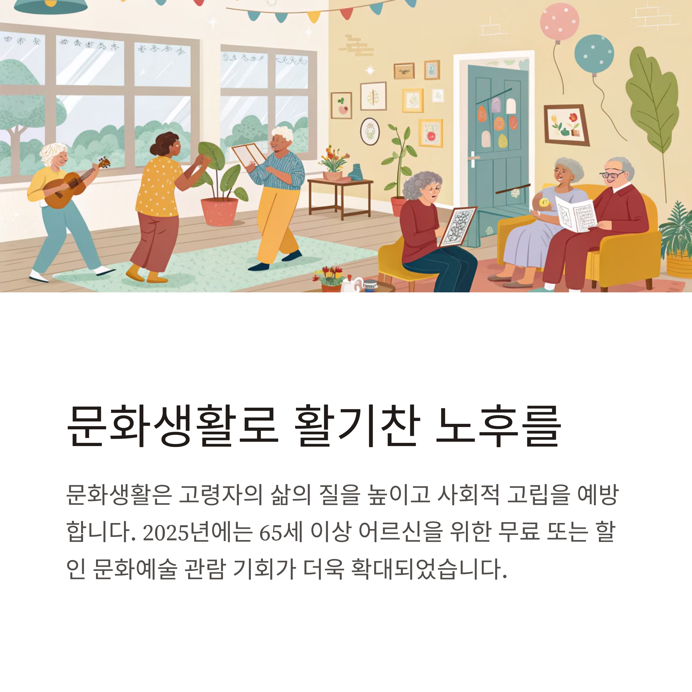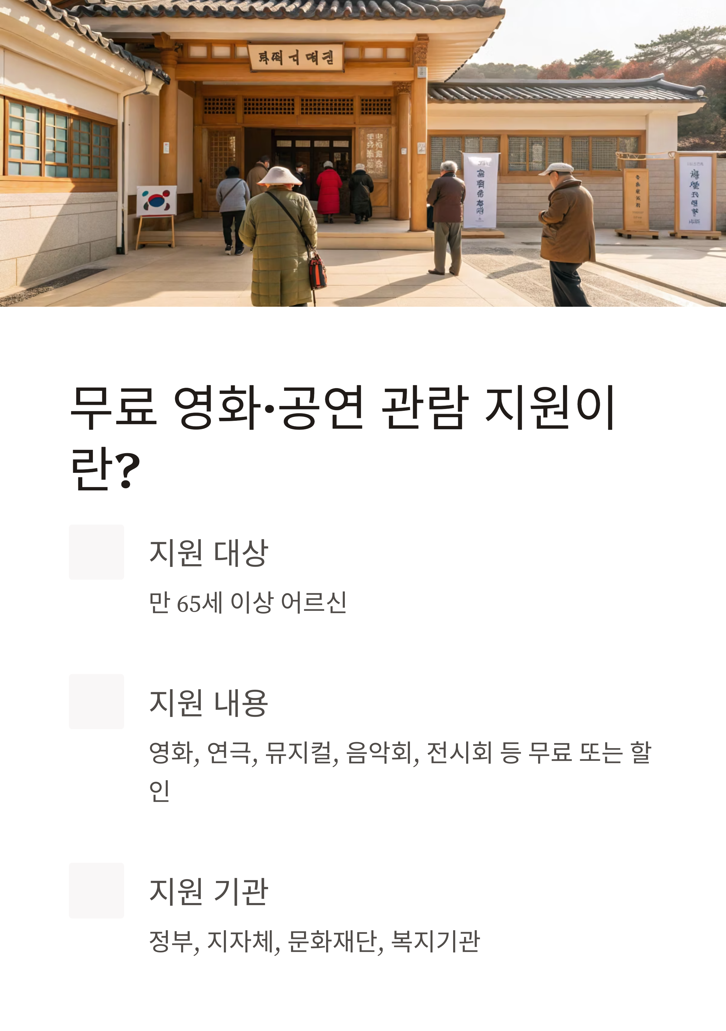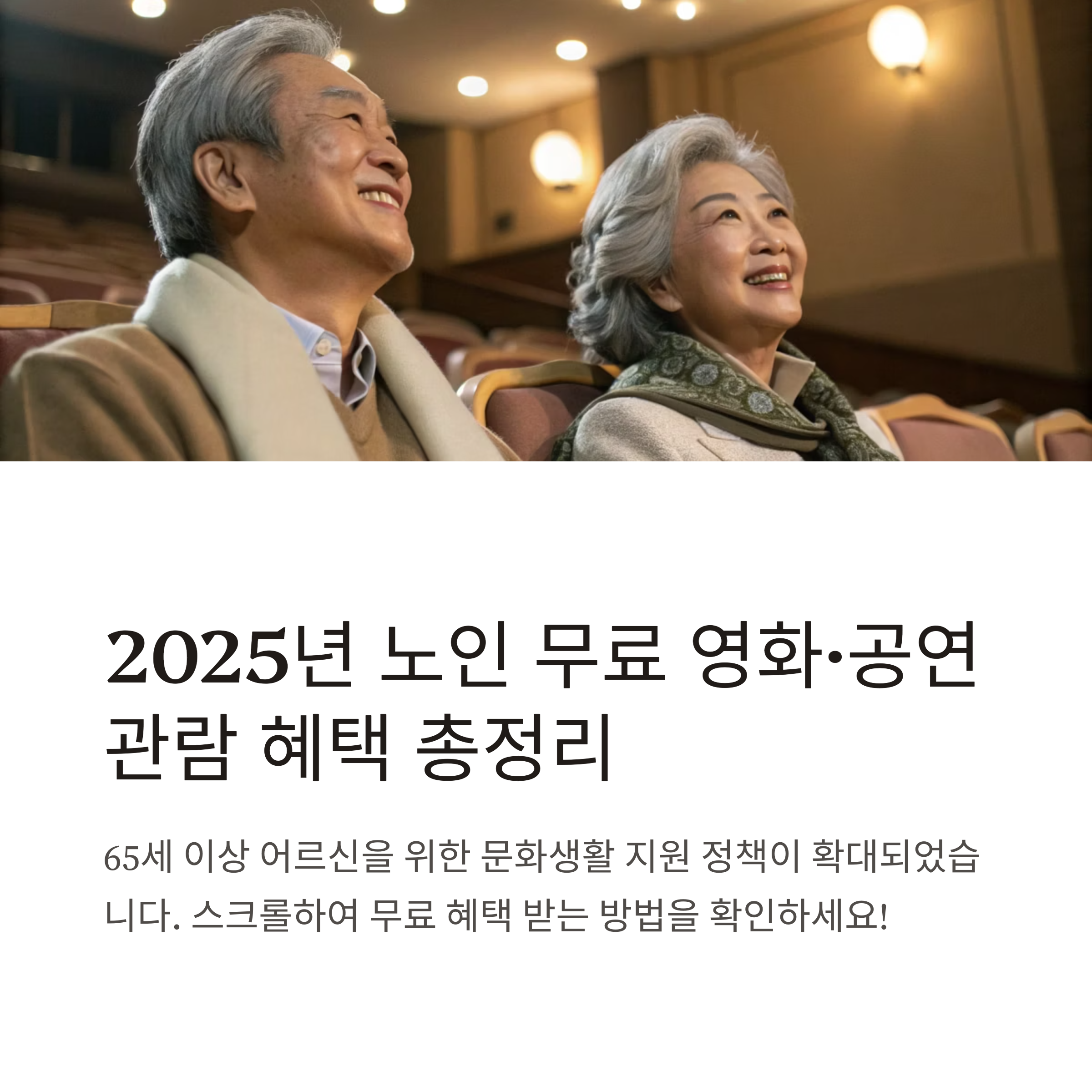 만 65세 이상 어르신이 영화관, 공연장, 문화예술회관 등에서 무료 또는 할인된 가격으로 영화, 연극, 뮤지컬, 음악회, 전시회 등을 관람할 수 있도록 정부와 지자체, 문화재단, 복지기관이 지원하는 정책입니다. 문화누리카드, 복지관 연계, 지자체 자체 프로그램 등 다양한 경로로 신청할 수 있습니다.