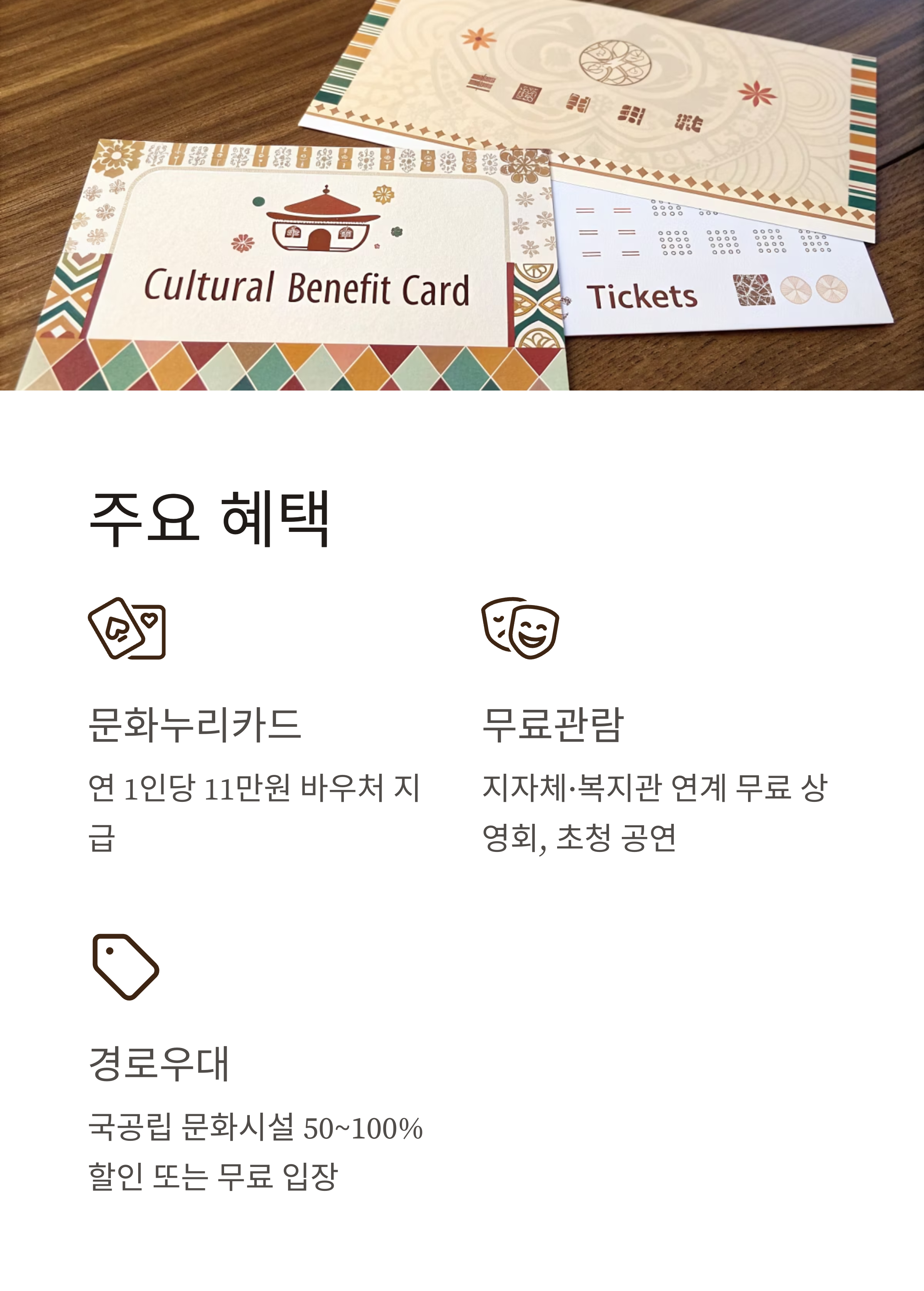 - 문화누리카드: 기초생활수급자·차상위계층(만 65세 이상)에게 연 1인당 11만원 바우처 지급, 영화관·공연장·전시관 등에서 사용 가능