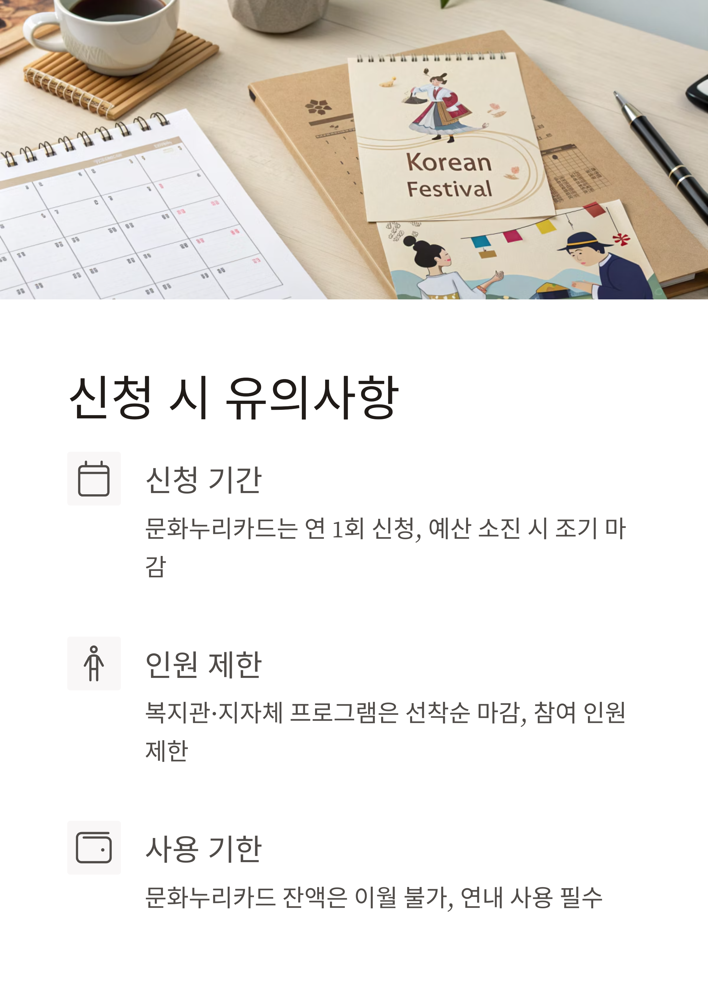 - 문화누리카드는 연 1회 신청, 예산 소진 시 조기 마감(매년 2~11월 접수)