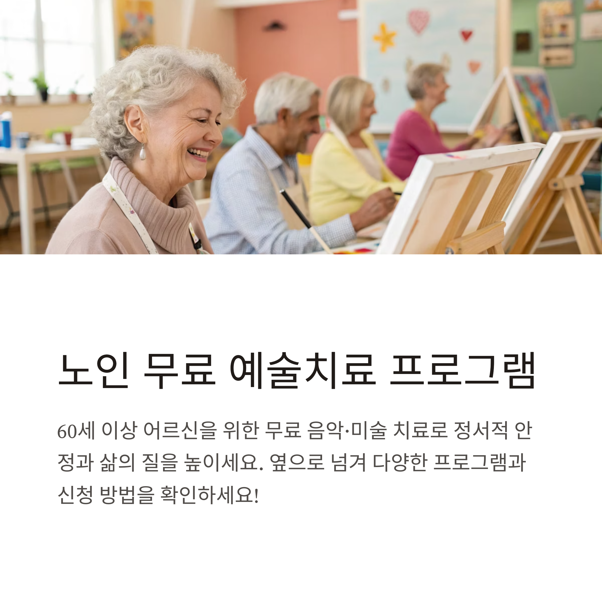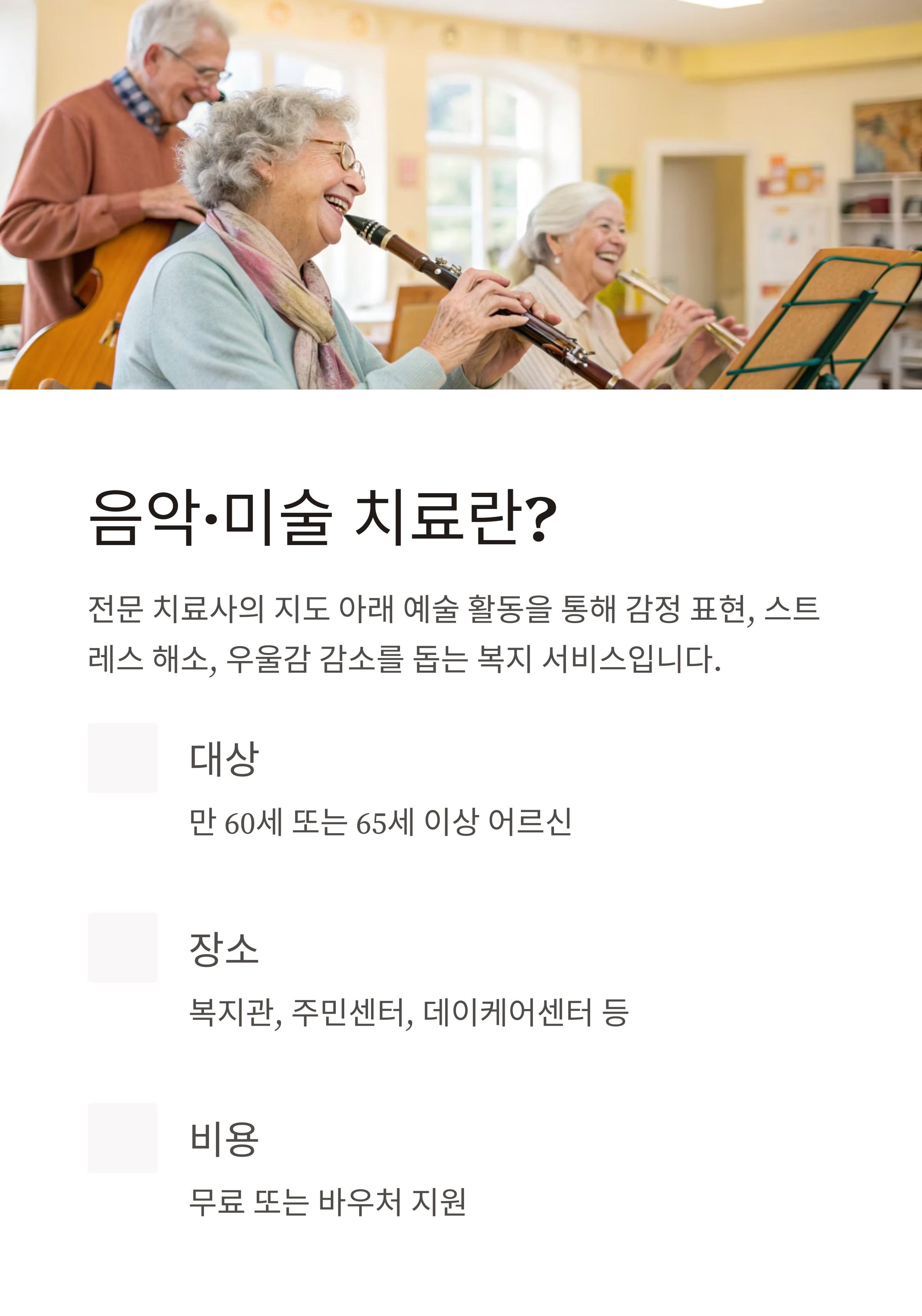 만 60세 또는 65세 이상 노인을 대상으로, 전문 음악치료사·미술치료사의 지도 아래 음악·미술 활동을 통해 감정 표현, 스트레스 해소, 우울감 감소, 사회적 교류를 돕는 복지 서비스입니다. 복지관, 주민센터, 데이케어센터, 지역사회센터 등에서 정기적으로 무료로 운영되며, 일부는 바우처 지원이나 찾아가는 프로그램으로도 제공됩니다.