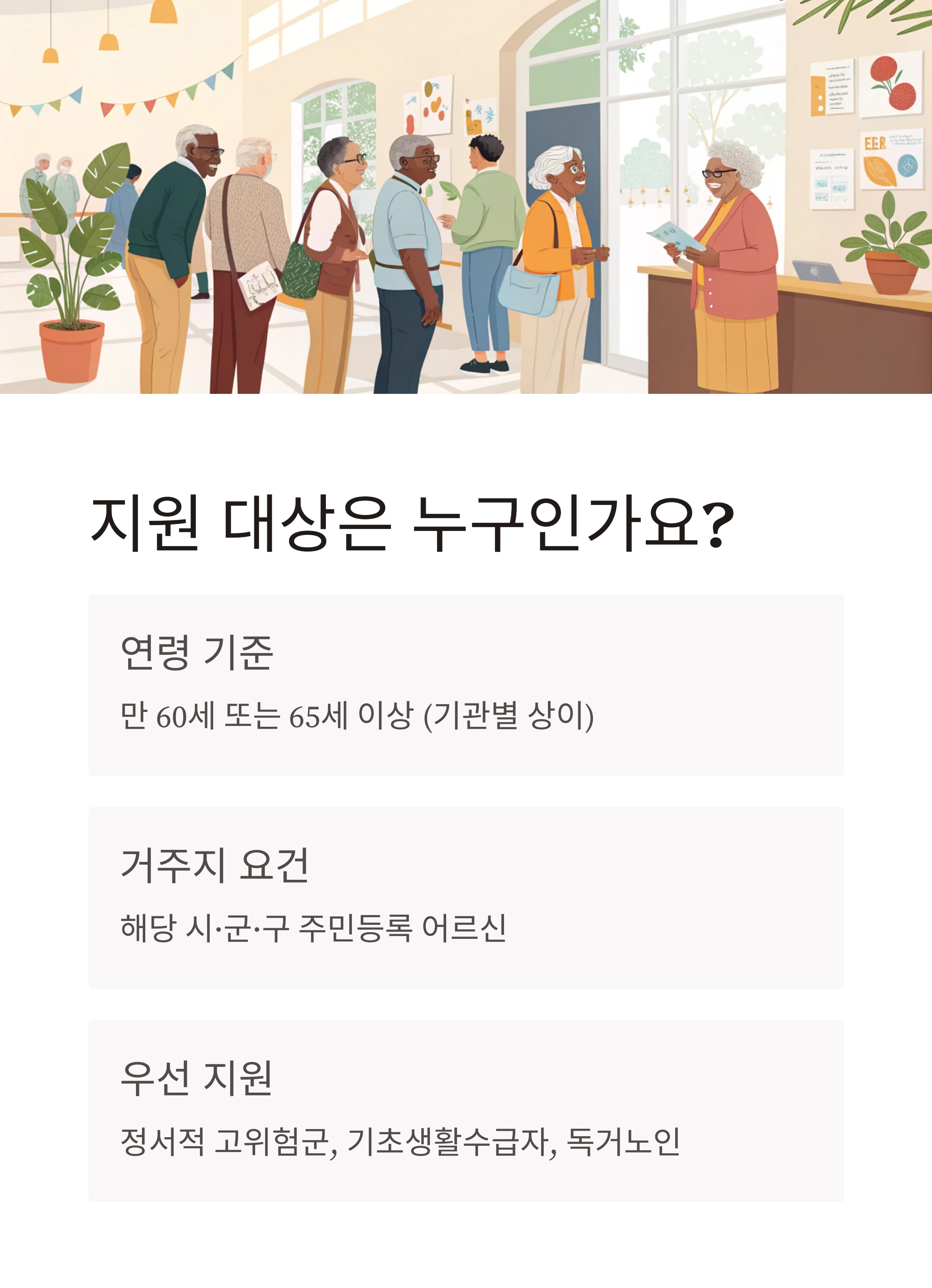- 연령 기준: 만 60세 또는 65세 이상(지자체·기관별 상이)