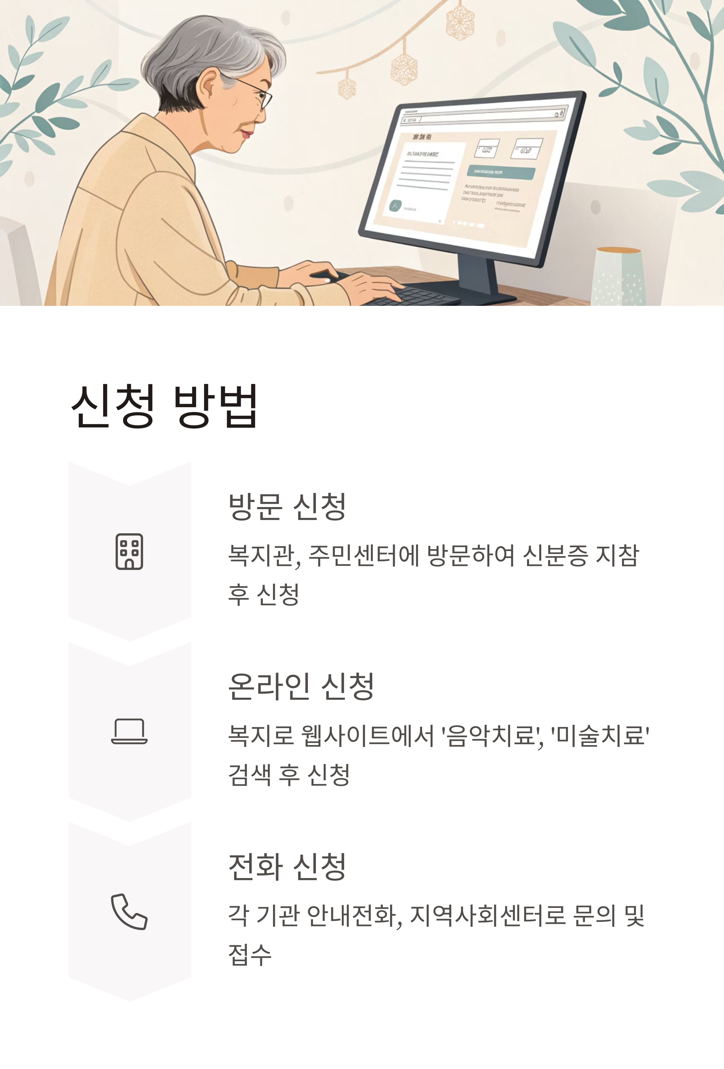 - 복지로(www.bokjiro.go.kr)에서 ‘음악치료’, ‘미술치료’ 등 검색 후 신청