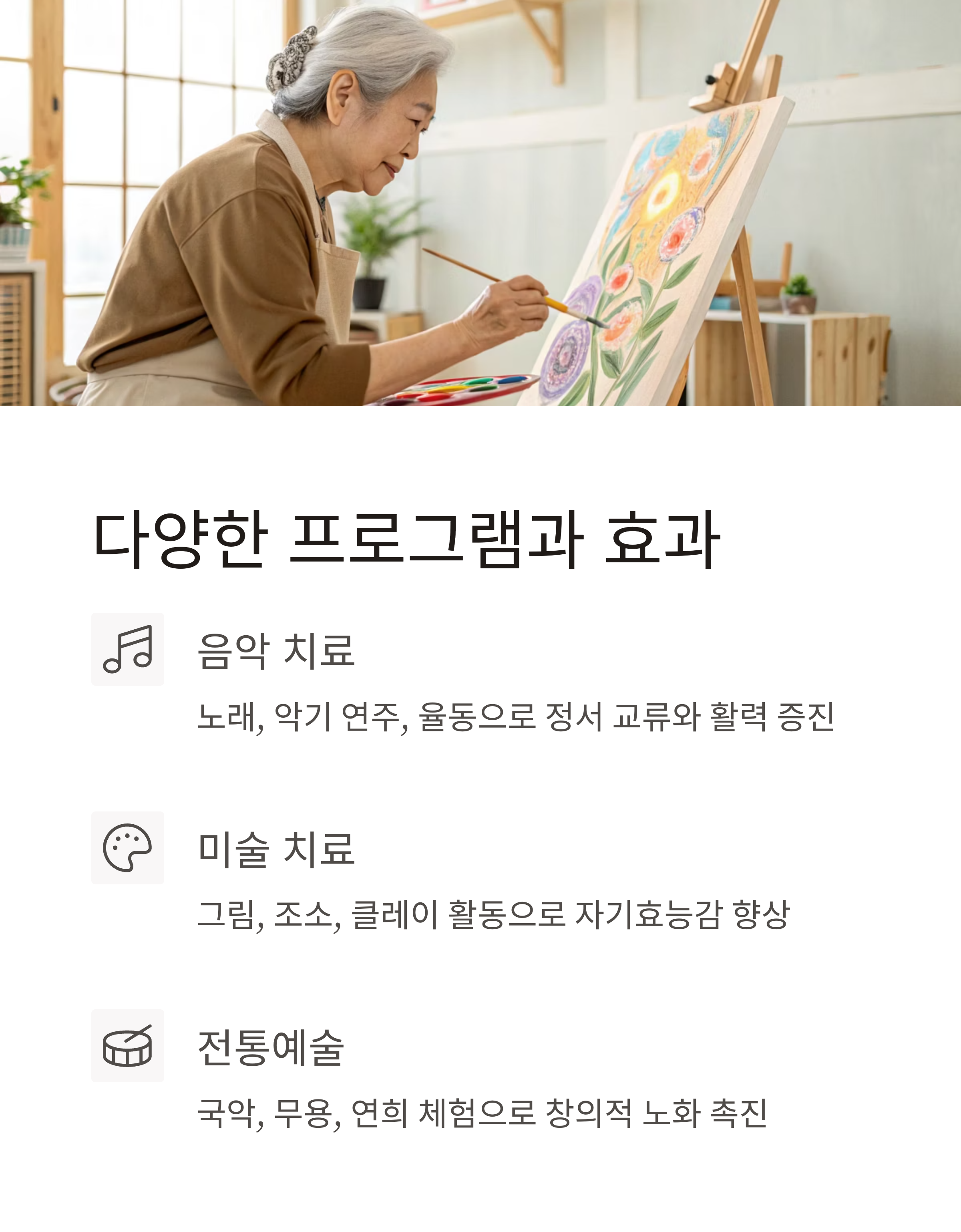 - 자신의 감정과 경험을 예술로 표현, 자기효능감 향상