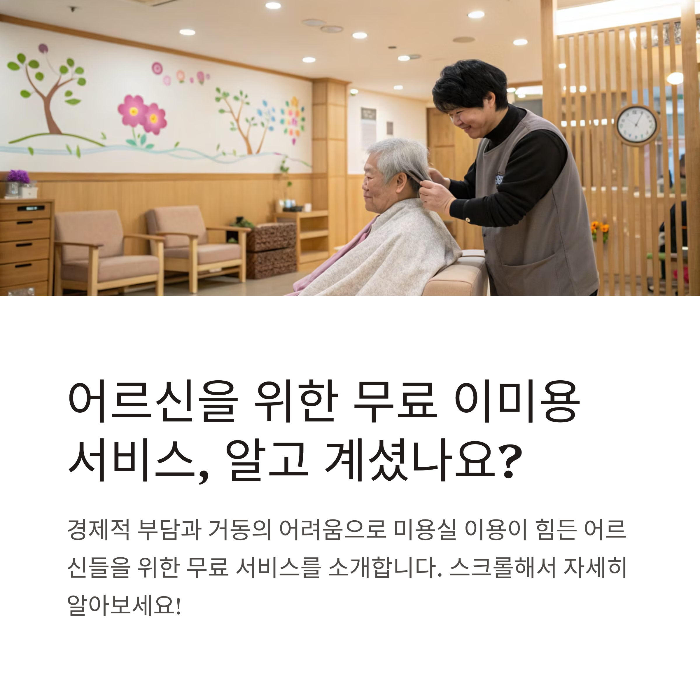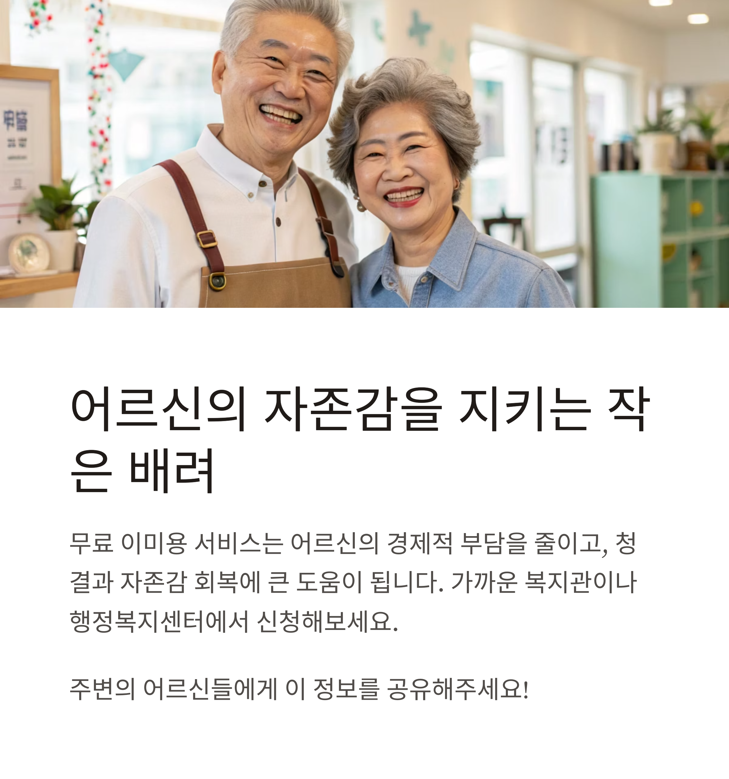 - 찾아가는 이미용 서비스: 거동이 불편한 어르신 가정 방문 또는 시설 내 서비스 제공