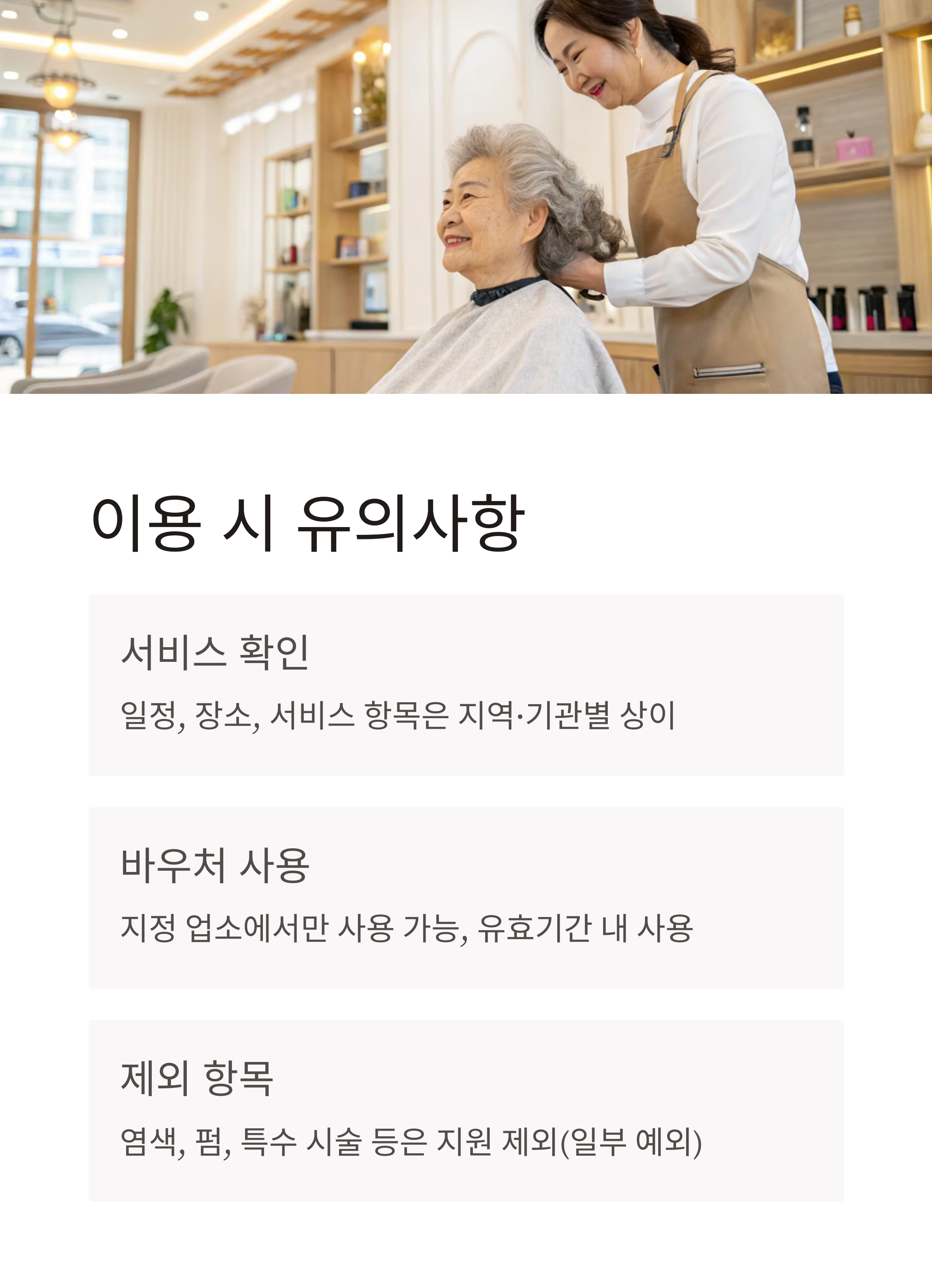 - 염색, 펌, 특수 시술 등은 지원 제외(일부 지역 예외)
