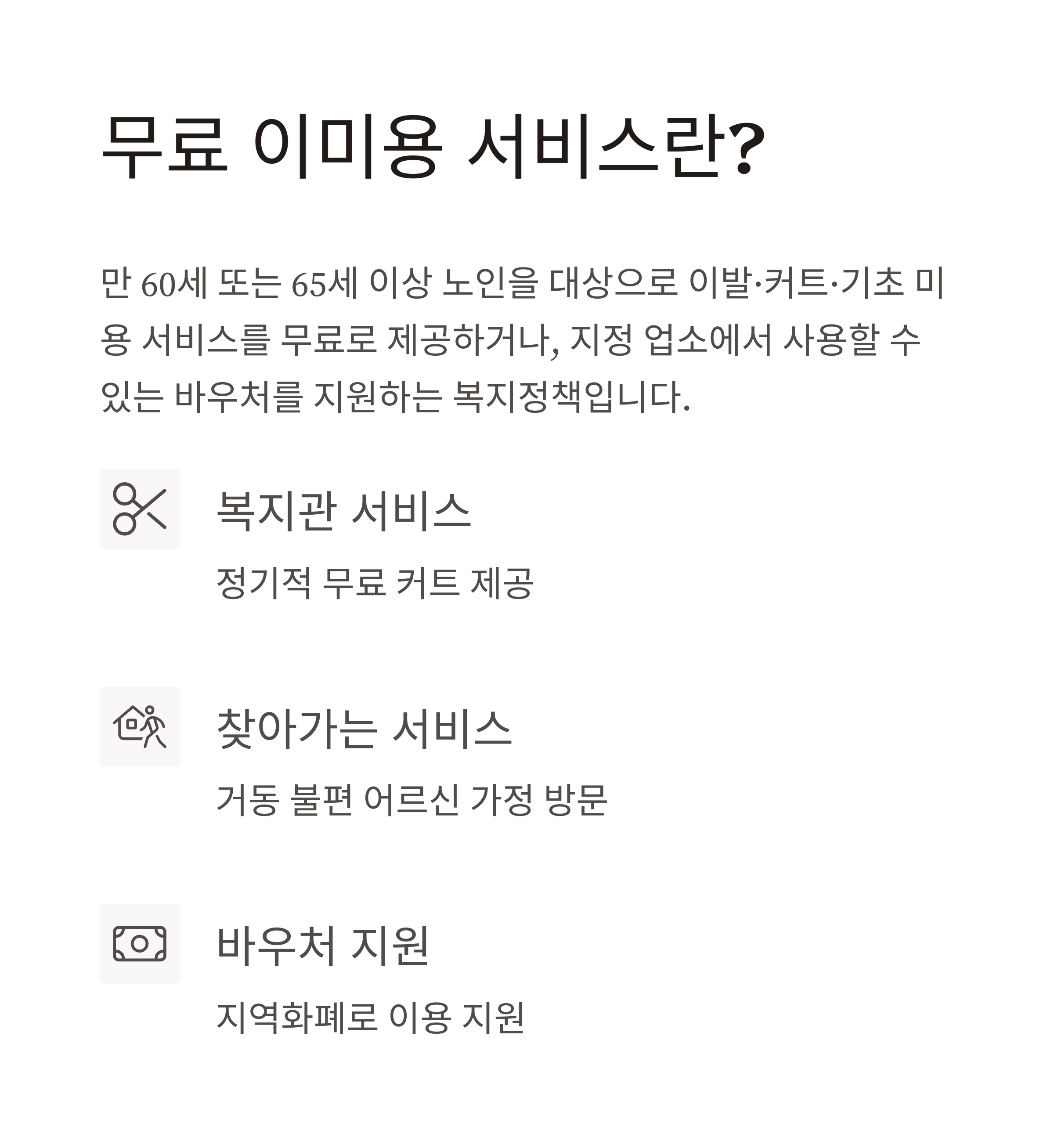 만 60세 또는 65세 이상 노인을 대상으로, 이발·커트·기초 미용 서비스를 무료로 제공하거나, 지정 이·미용업소에서 사용할 수 있는 바우처(지역화폐)를 지원하는 복지정책입니다. 복지관, 주야간보호센터, 경로당, 행정복지센터, 자원봉사단체 등에서 정기적으로 서비스를 제공합니다.