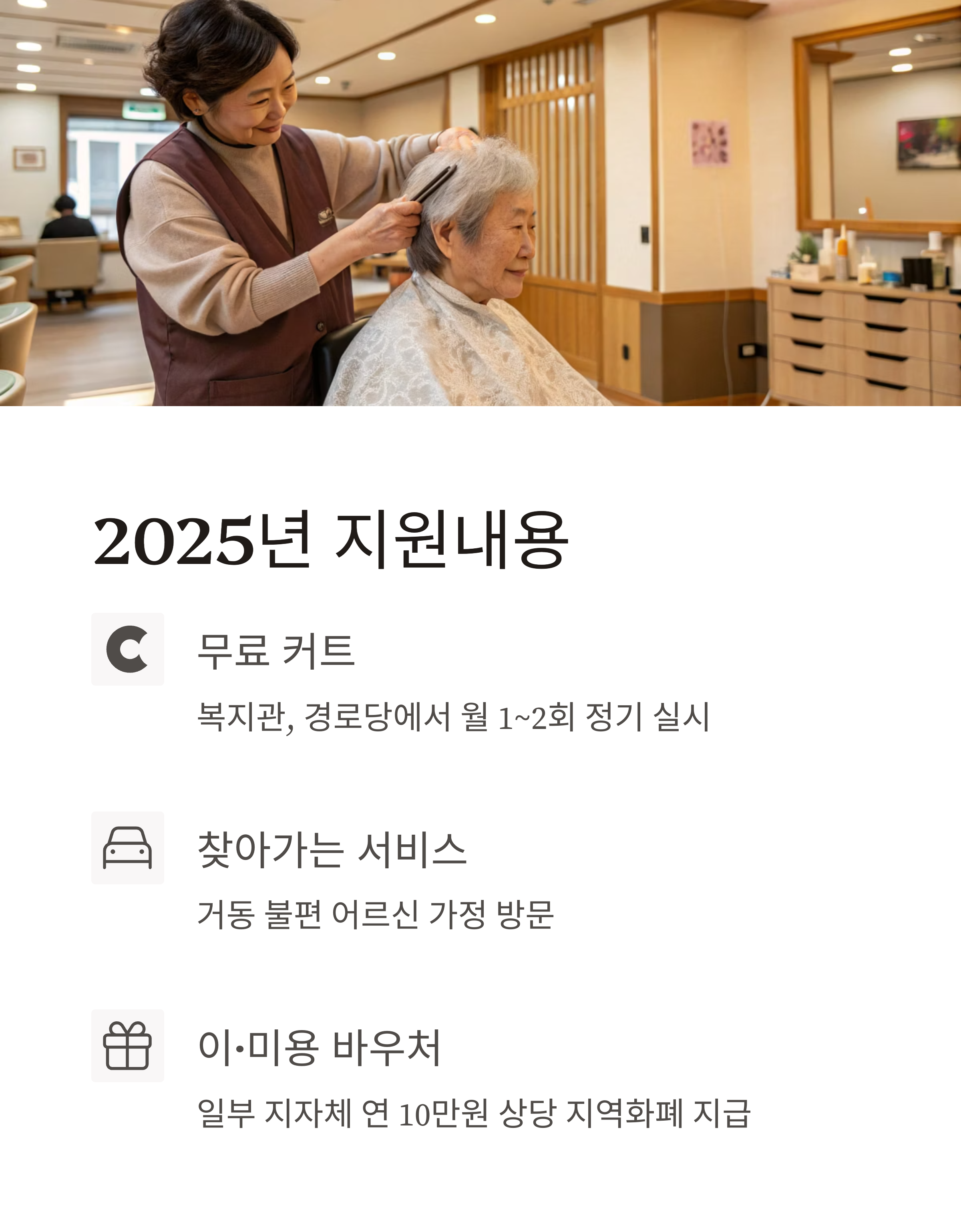 - 무료 커트(이발·미용): 복지관, 경로당, 주야간보호센터, 자원봉사단체에서 월 1~2회 정기 실시