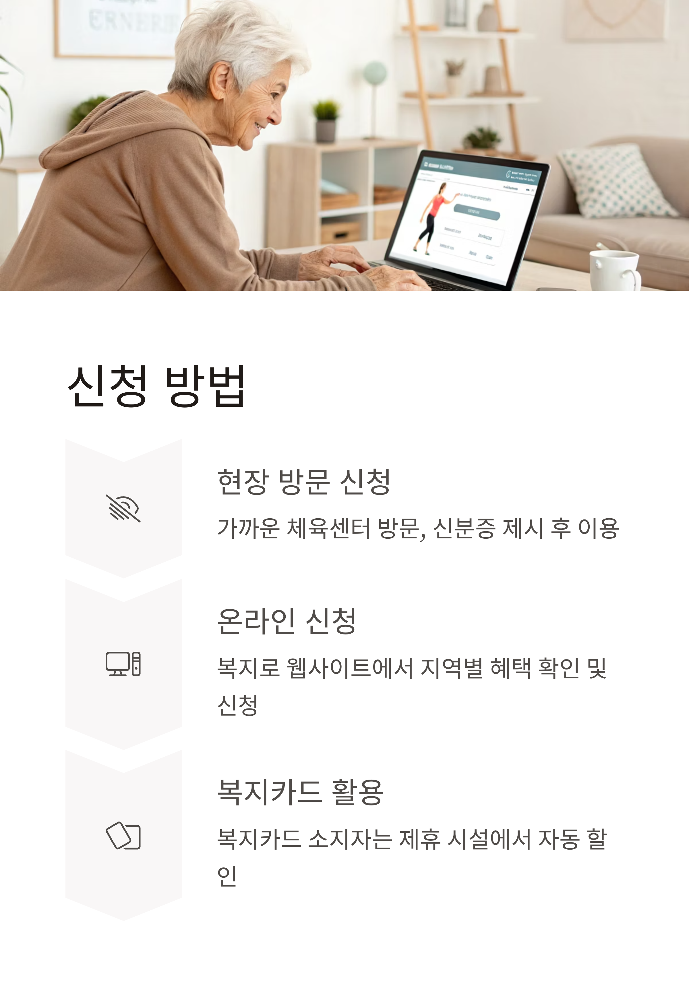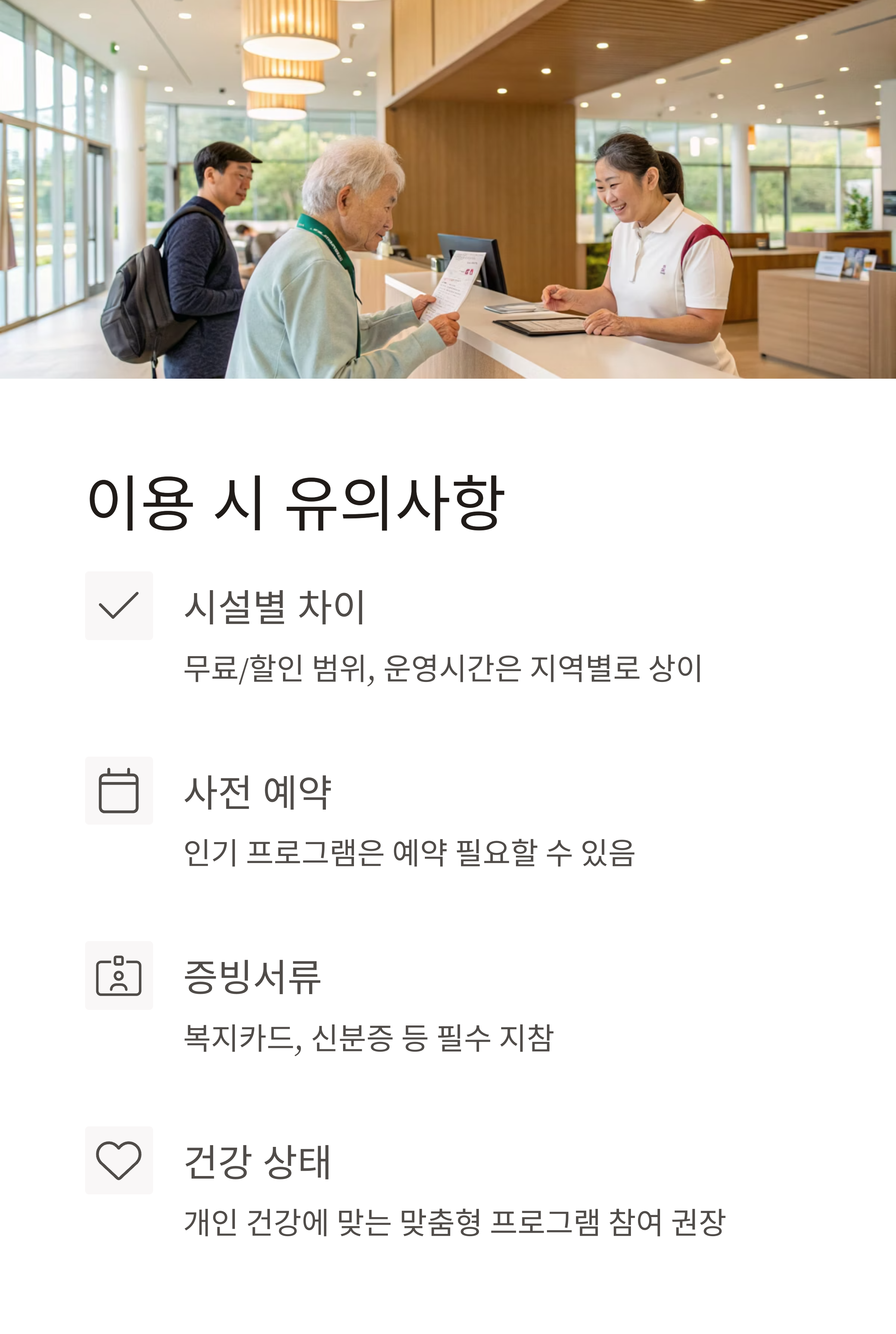 - 신청 방법: 신분증(주민등록증, 복지카드 등) 현장 제시, 일부 시설은 회원증 발급 필요