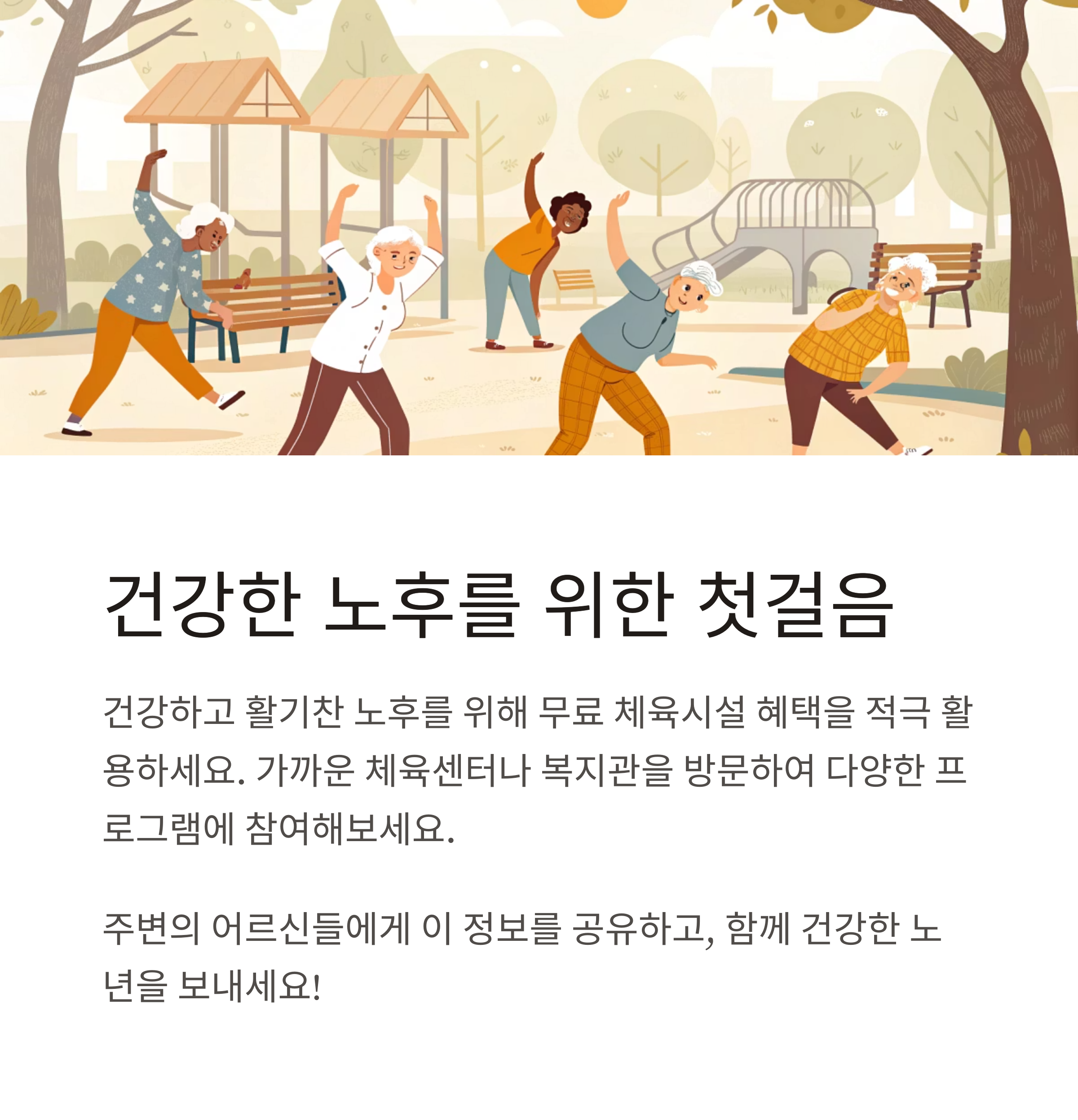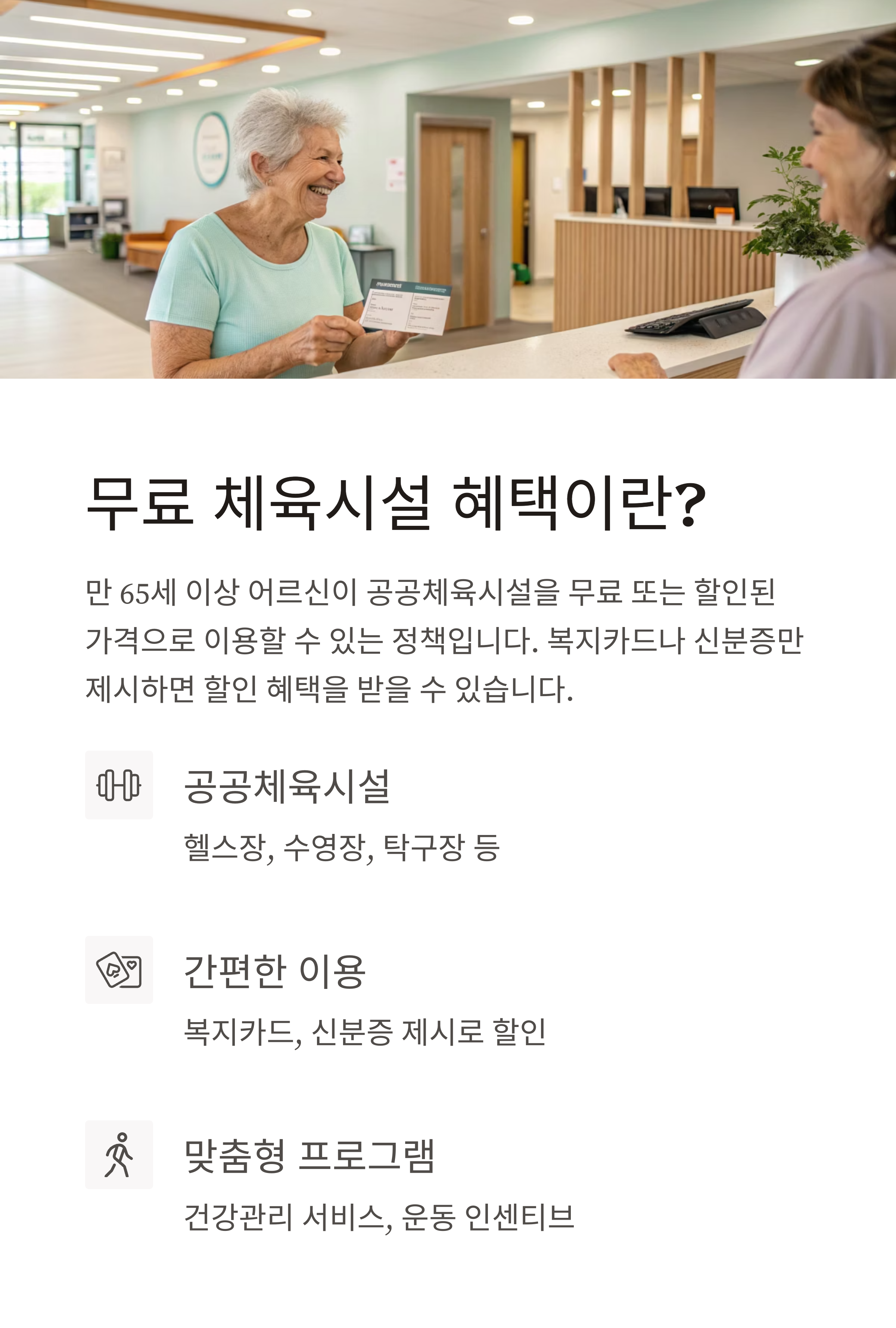 만 65세 이상 노인이 공공체육시설(헬스장, 수영장, 탁구장 등)과 시니어 친화형 국민체육센터, 노인복지관 내 체육시설을 무료 또는 할인된 가격으로 이용할 수 있도록 지원하는 정책입니다. 일부 지자체는 복지카드, 신분증만 제시해도 자동으로 할인 또는 무료 입장이 가능합니다. 또한 맞춤형 운동프로그램, 건강관리 서비스, 운동 인센티브 등 다양한 부가 혜택도 함께 제공됩니다.