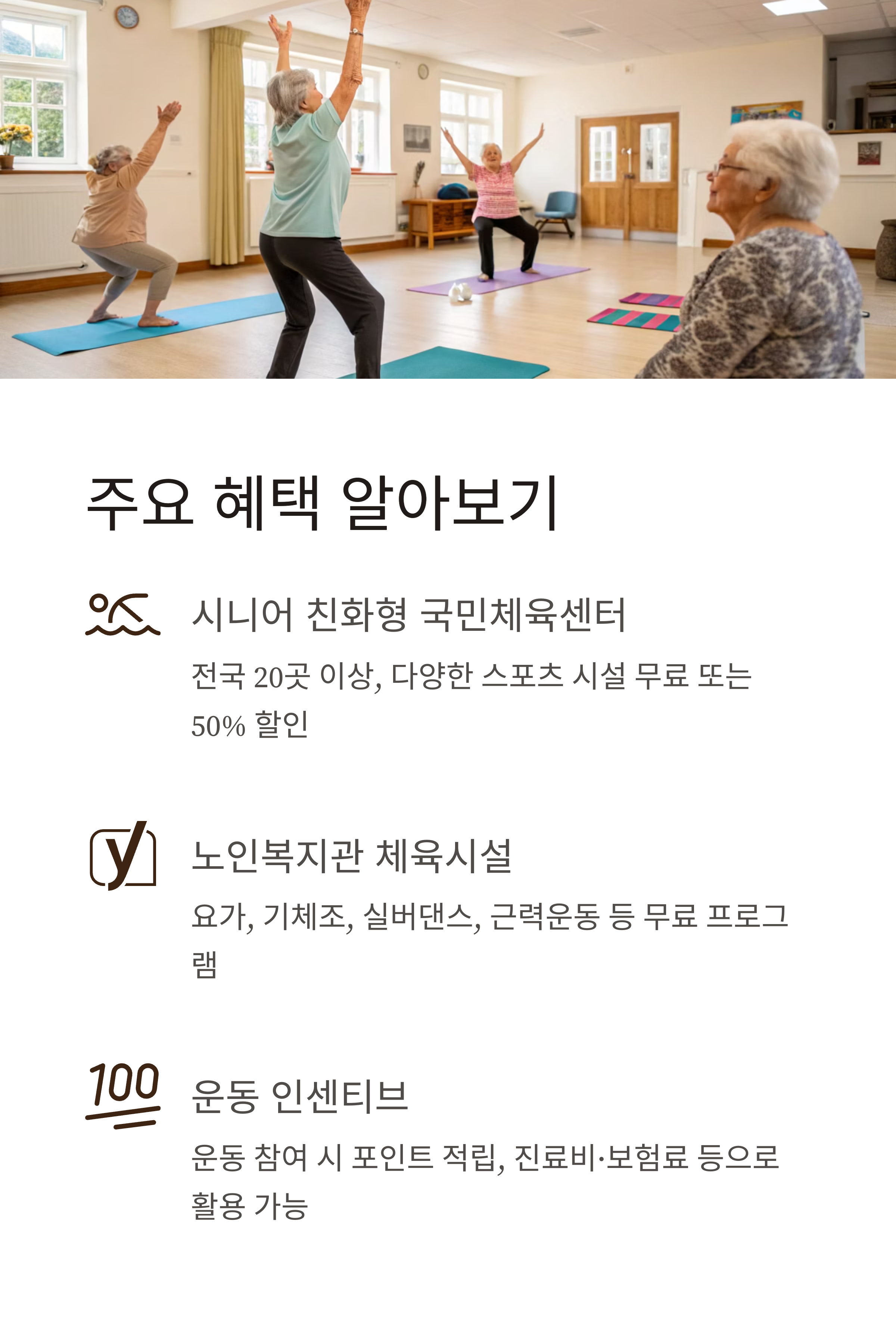 - 노인복지관 체육시설: 요가, 기체조, 실버댄스, 근력운동 등 무료 건강 프로그램 운영