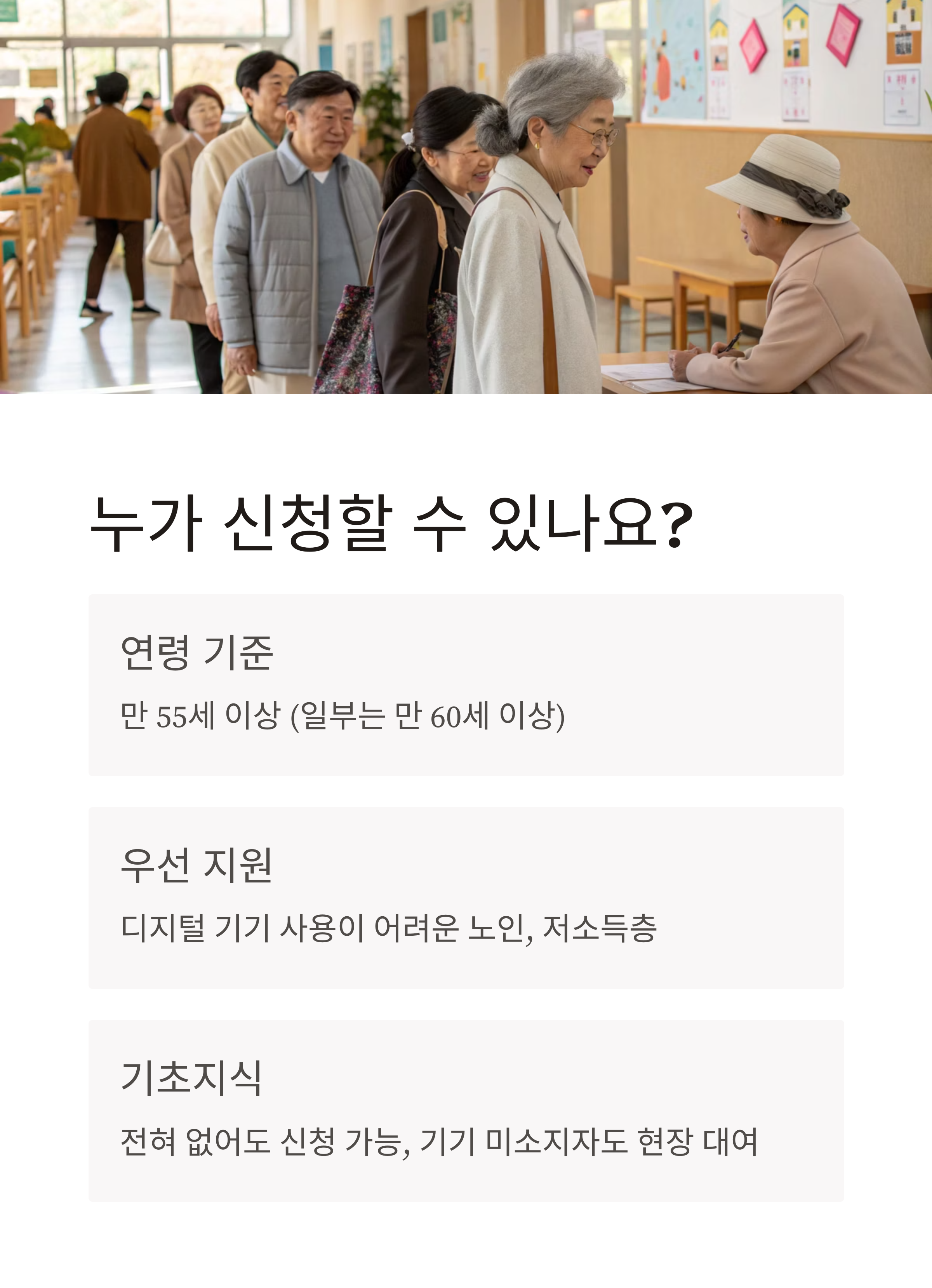 - 지원 우선순위: 디지털 기기 사용이 어려운 노인, 저소득층, 정보 소외계층