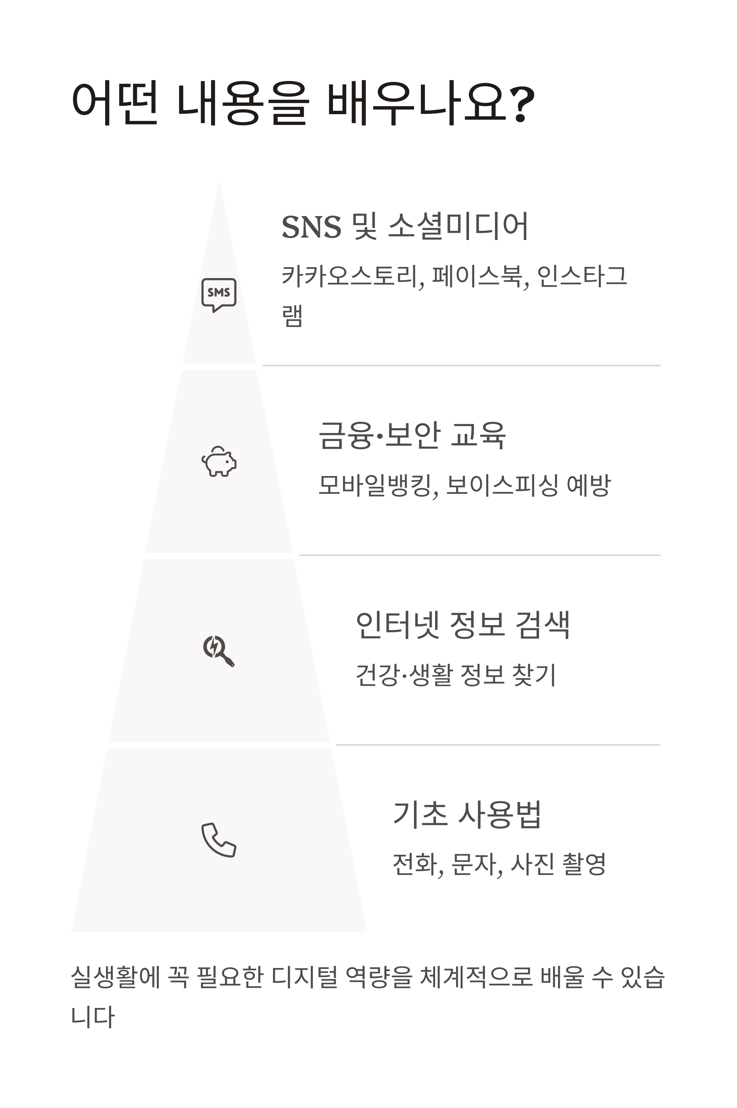 - 앱 활용: 카카오톡, 유튜브, 네이버, 은행 앱, 정부·공공앱, 교통앱, 병원 예약 등