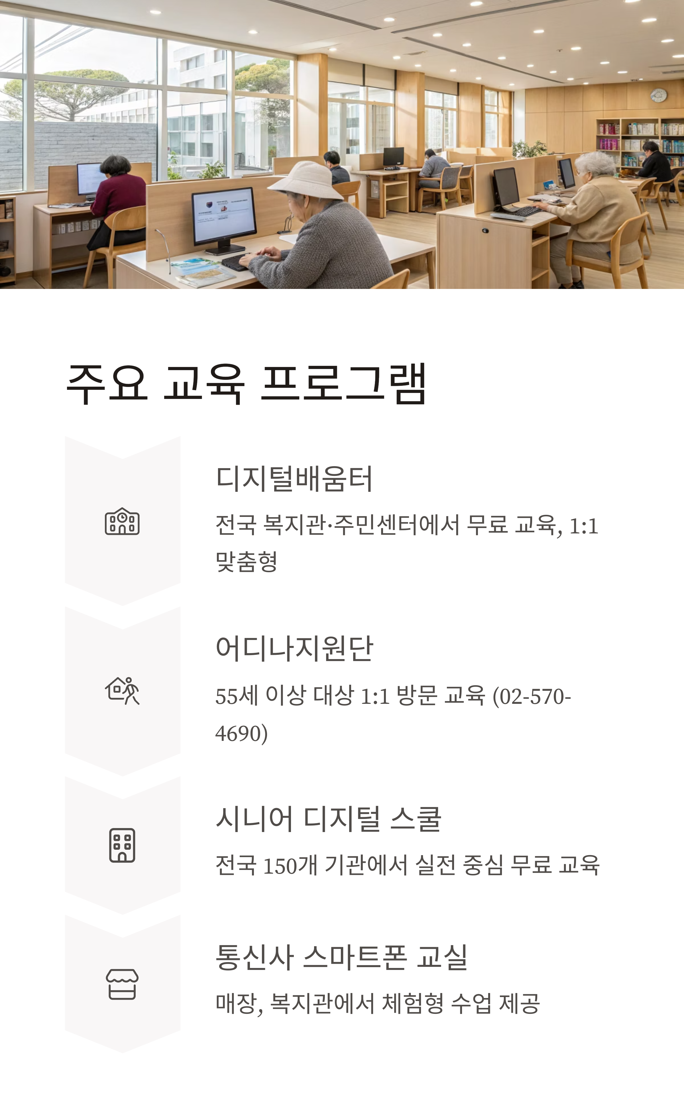 - 전국 복지관·주민센터·도서관 등에서 무료로 스마트폰·키오스크 등 디지털 교육