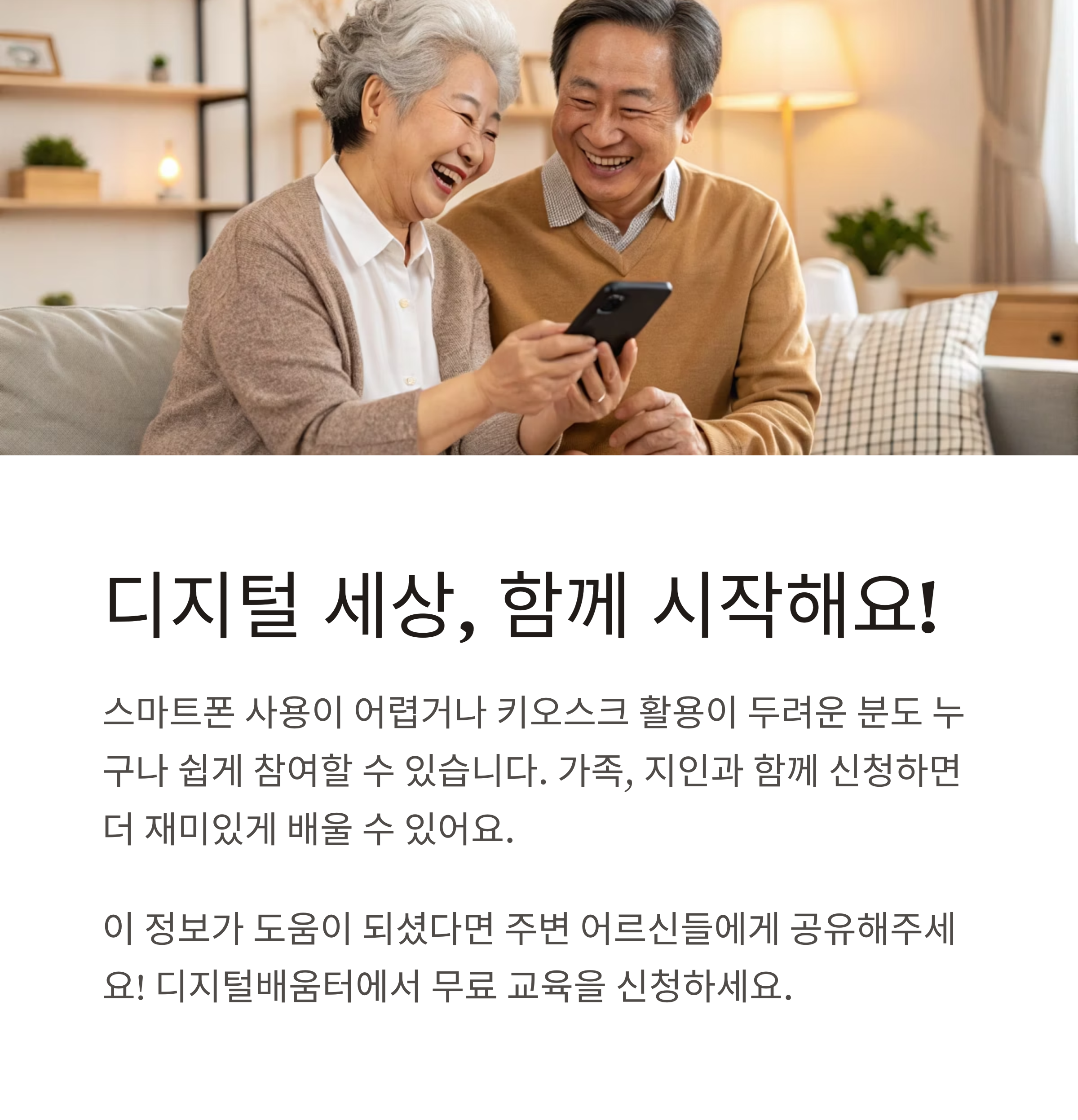 노인 대상 스마트폰·디지털 교육 지원 정책은 어르신의 정보격차 해소와 삶의 질 향상에 큰 도움이 됩니다. 스마트폰 사용이 어렵거나, 키오스크·앱 활용이 두려운 분도 누구나 쉽게 참여할 수 있습니다. 가족, 지인과 함께 신청하면 더 재미있고 효과적으로 배울 수 있으니, 가까운 복지관이나 디지털배움터에서 꼭 신청해보세요.
