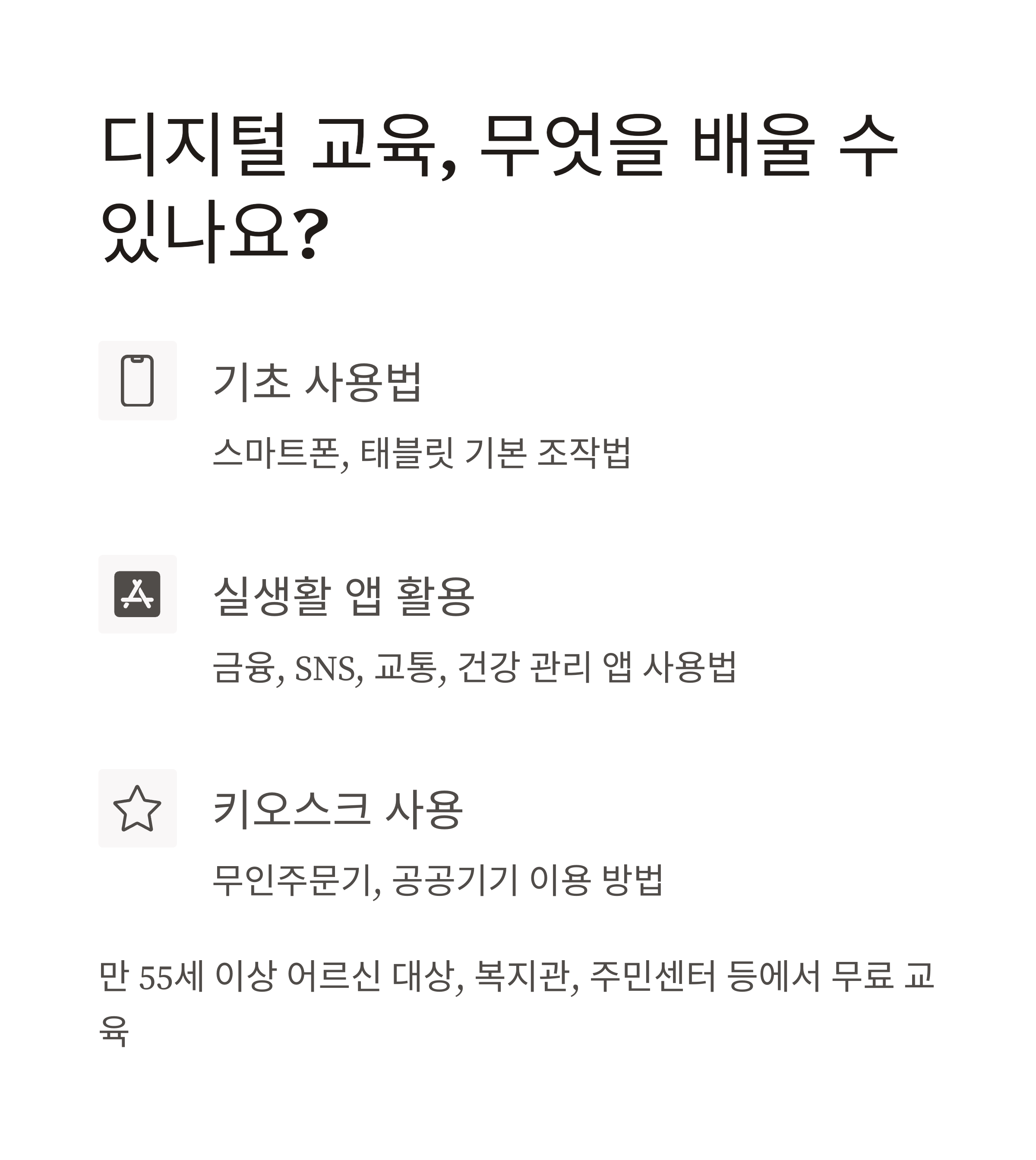 - 매장, 복지관 등에서 기본 사용법, 앱 활용, 보안 교육
