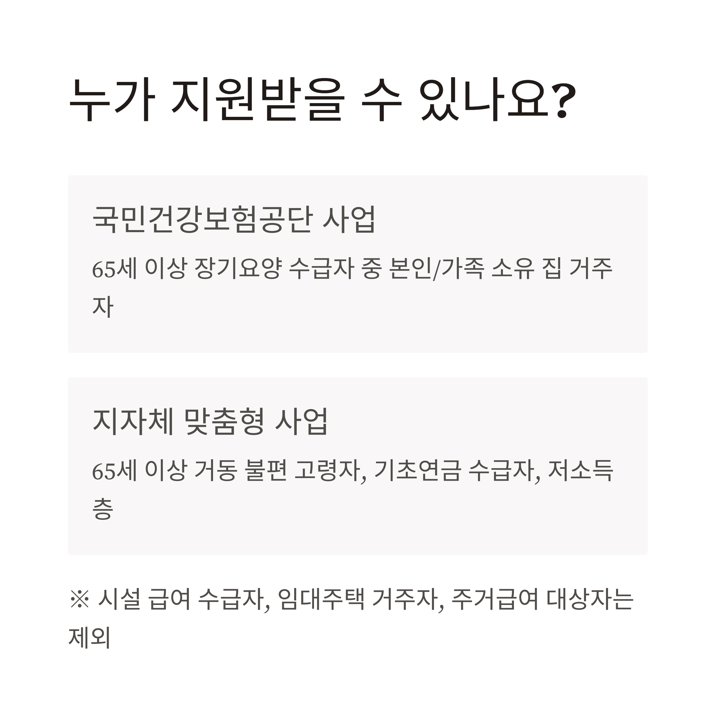 - 장기요양 수급자, 기초연금 수급자 등 자격요건을 반드시 확인
