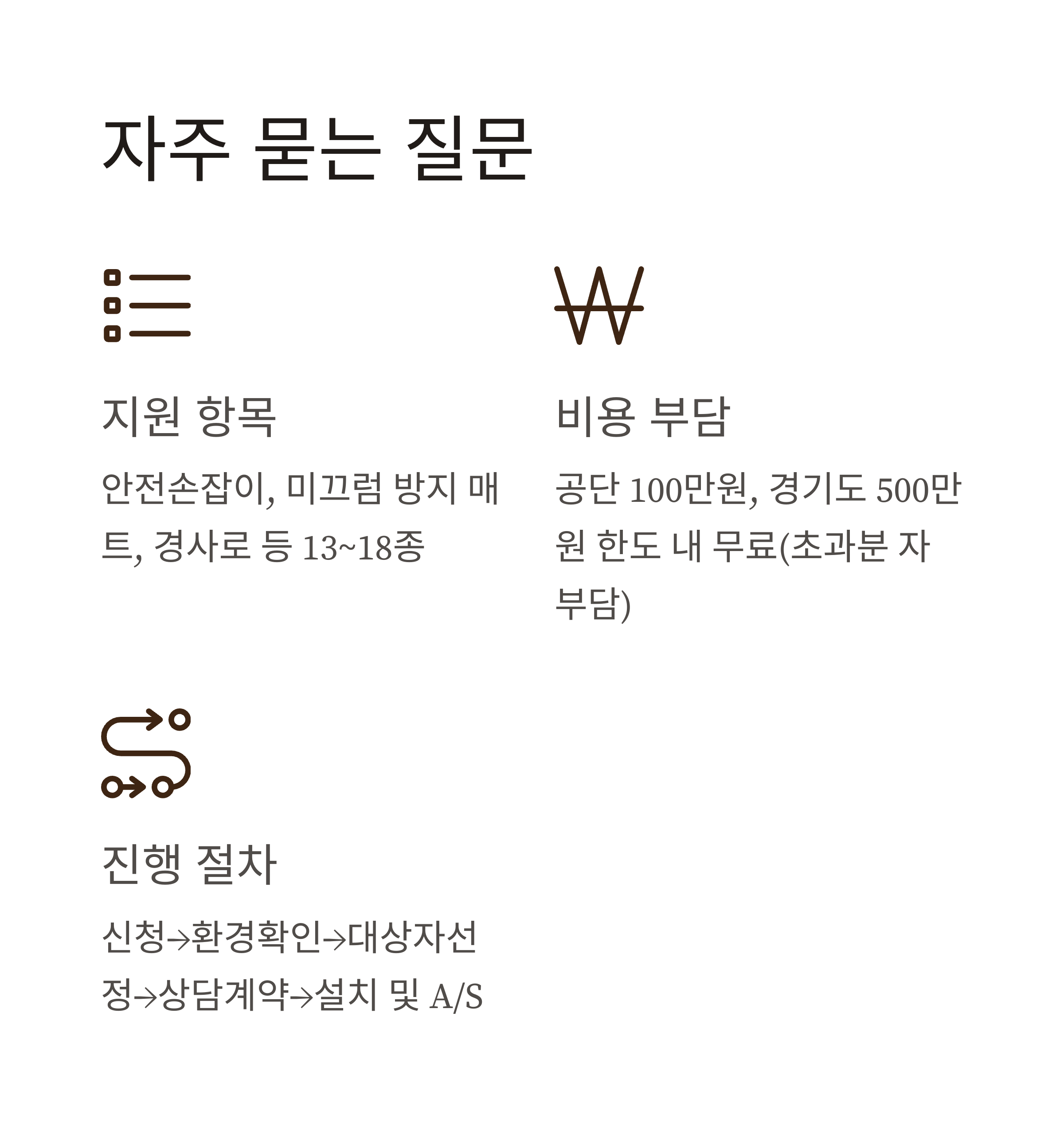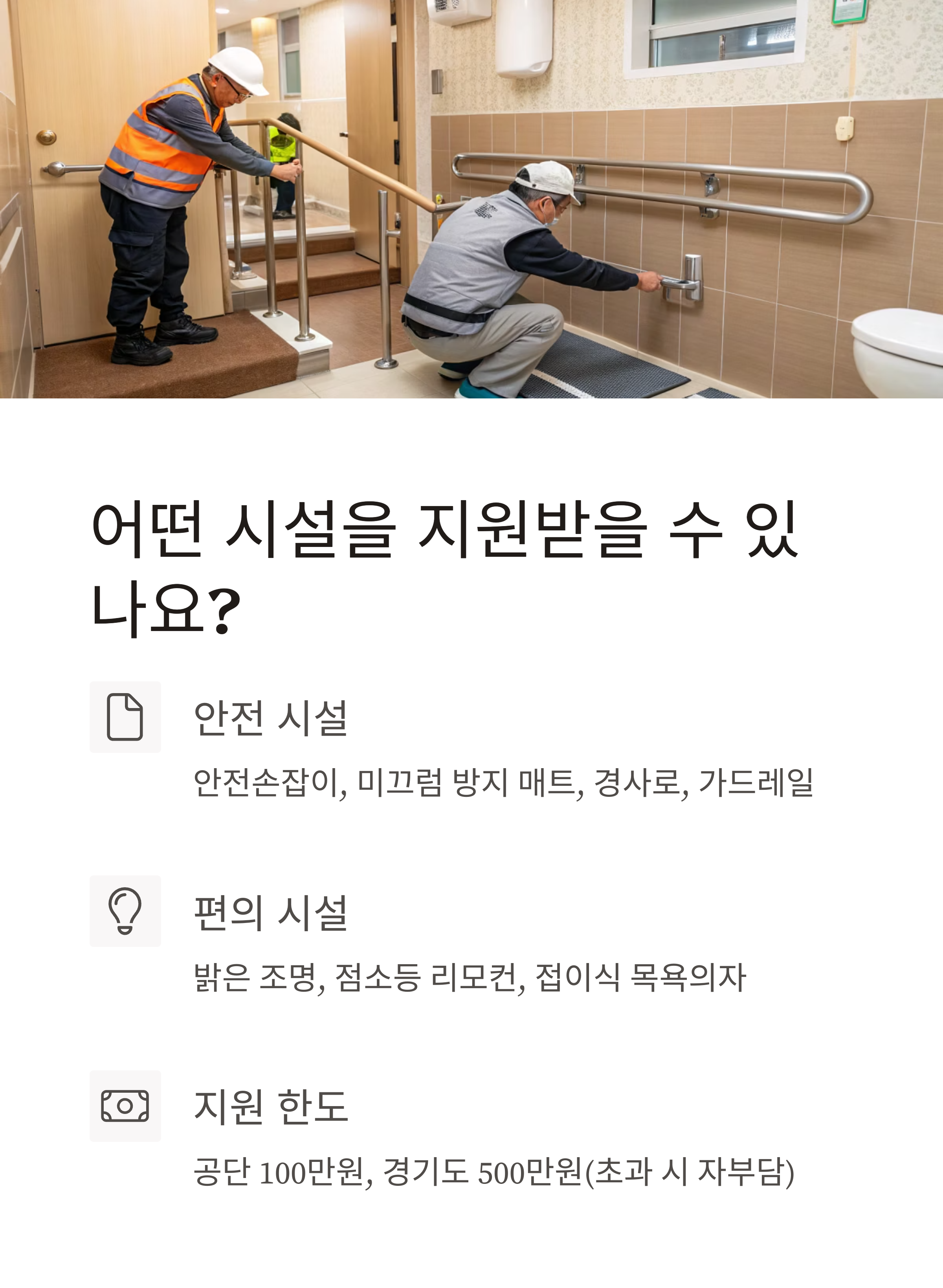 안전손잡이, 미끄럼 방지 매트, 경사로, 밝은 조명, 점소등 등 13~18종 항목(사업별 상이) - Q. 비용 부담은?