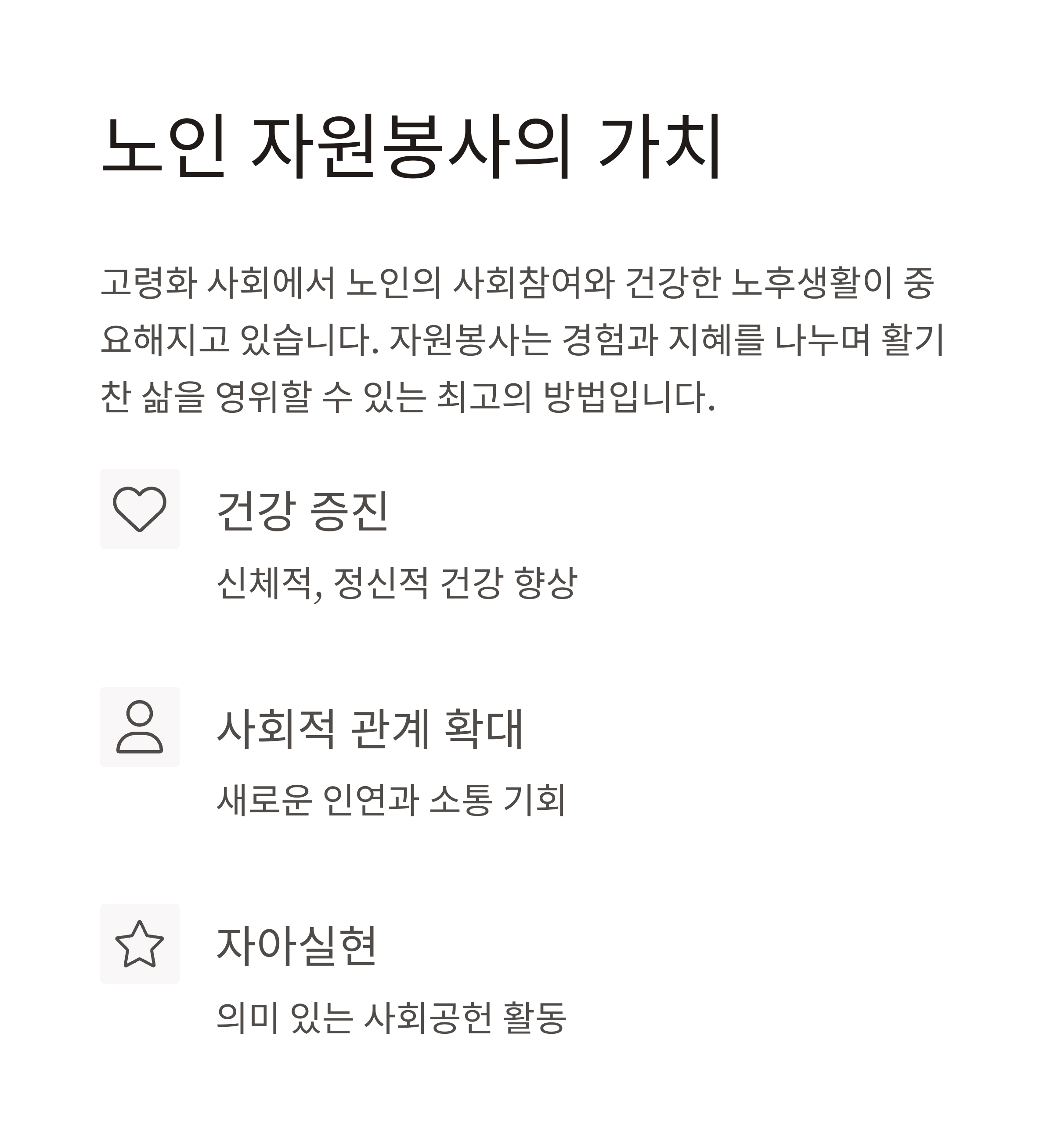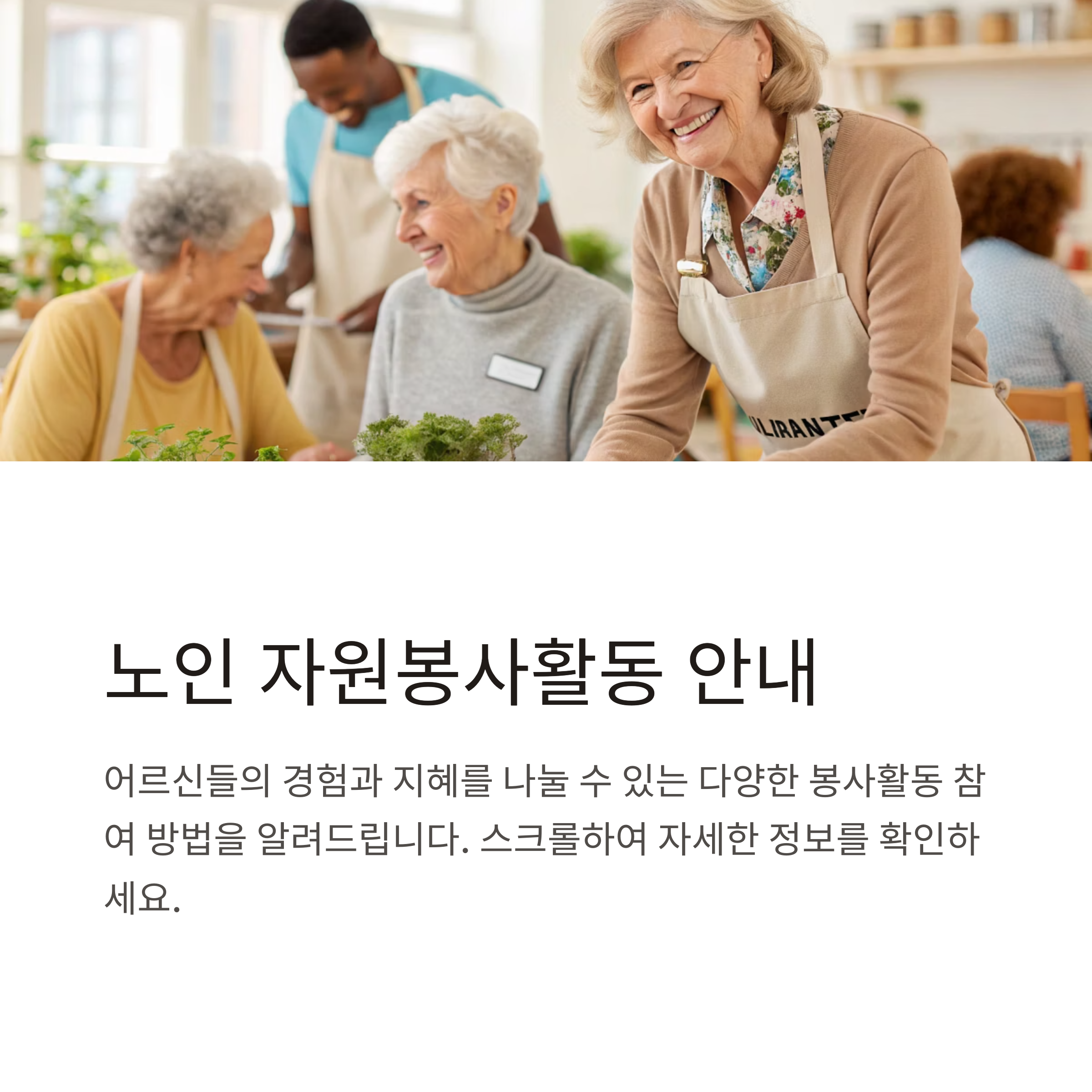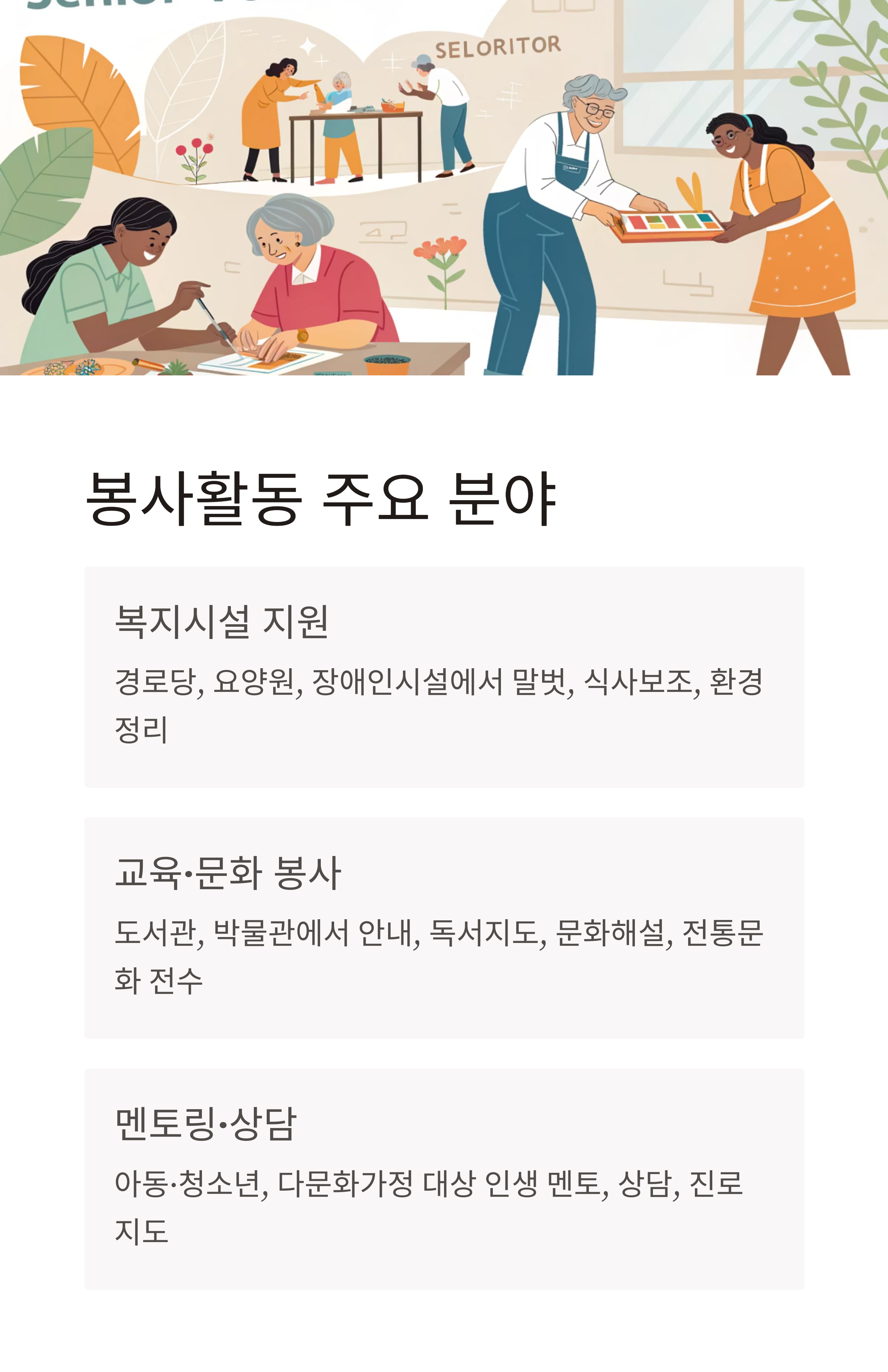 - 복지시설 지원: 경로당, 요양원, 장애인시설, 지역아동센터 등에서 말벗, 식사보조, 환경정리, 프로그램 지원