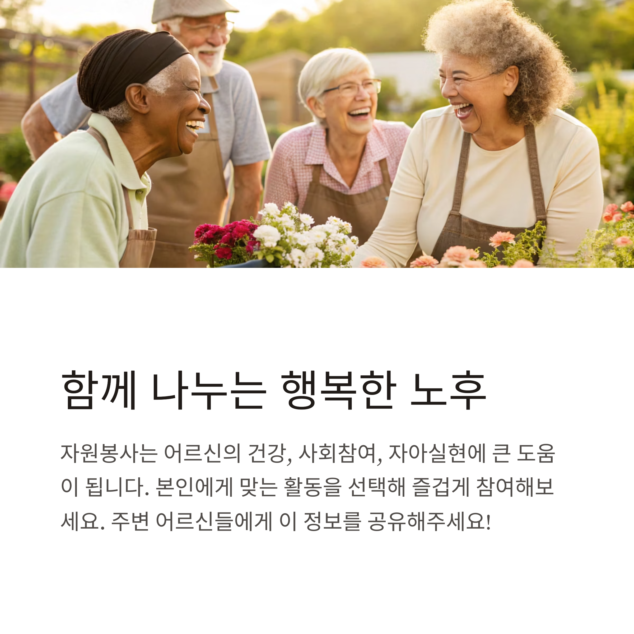 자원봉사활동은 어르신의 건강, 사회참여, 자아실현에 큰 도움이 됩니다. 1365포털, 복지관, 주민센터 등에서 다양한 프로그램을 확인하고, 본인에게 맞는 활동을 선택해 즐겁게 참여해보세요. 활동 전 건강상태, 이동 가능성, 실비 지원 여부를 꼭 확인하시고, 궁금한 점은 자원봉사센터에 문의하면 친절하게 안내받을 수 있습니다.