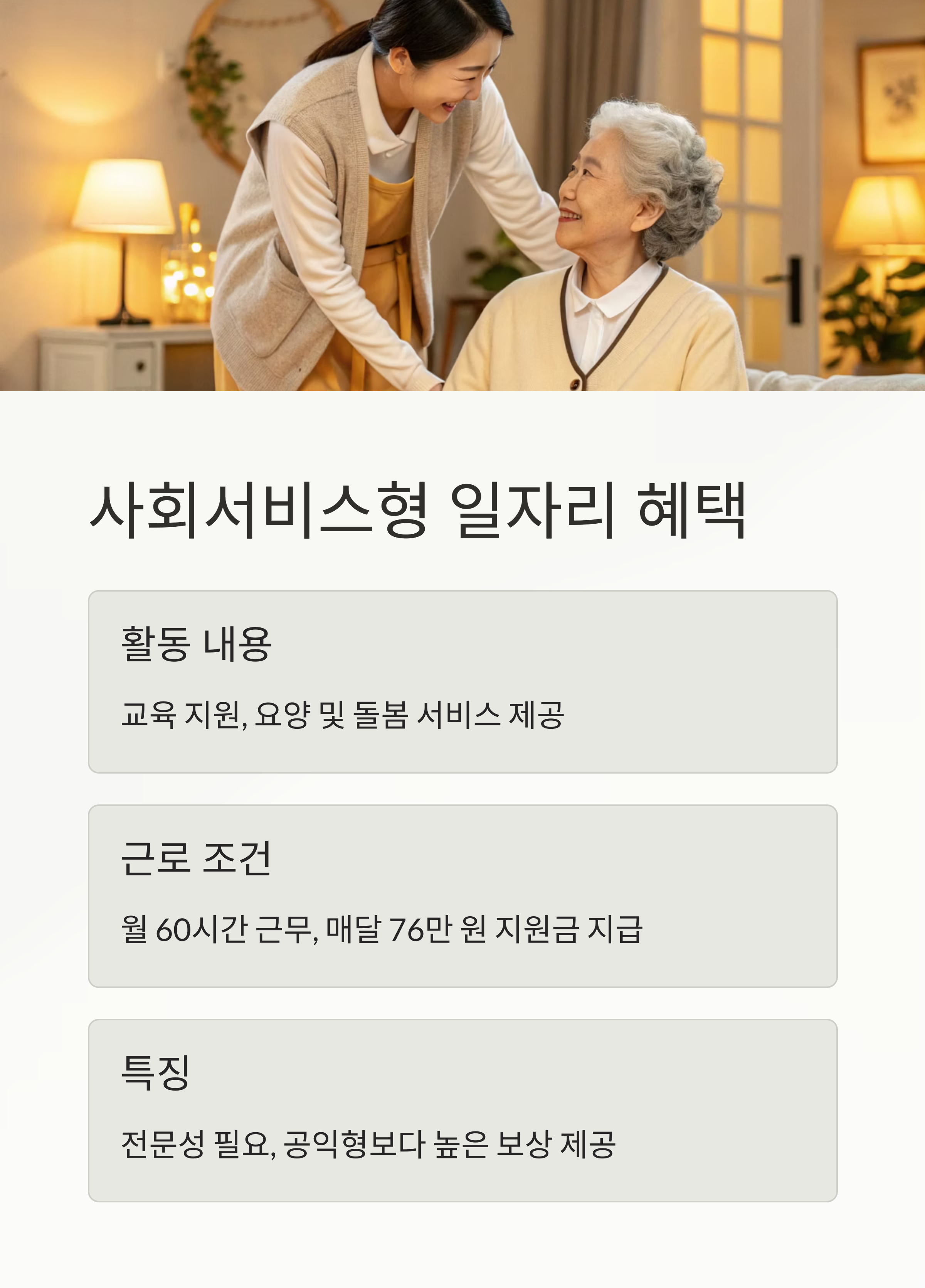 | 사회서비스형 | 60시간 | 76만 원 | 교육·돌봄 서비스 |