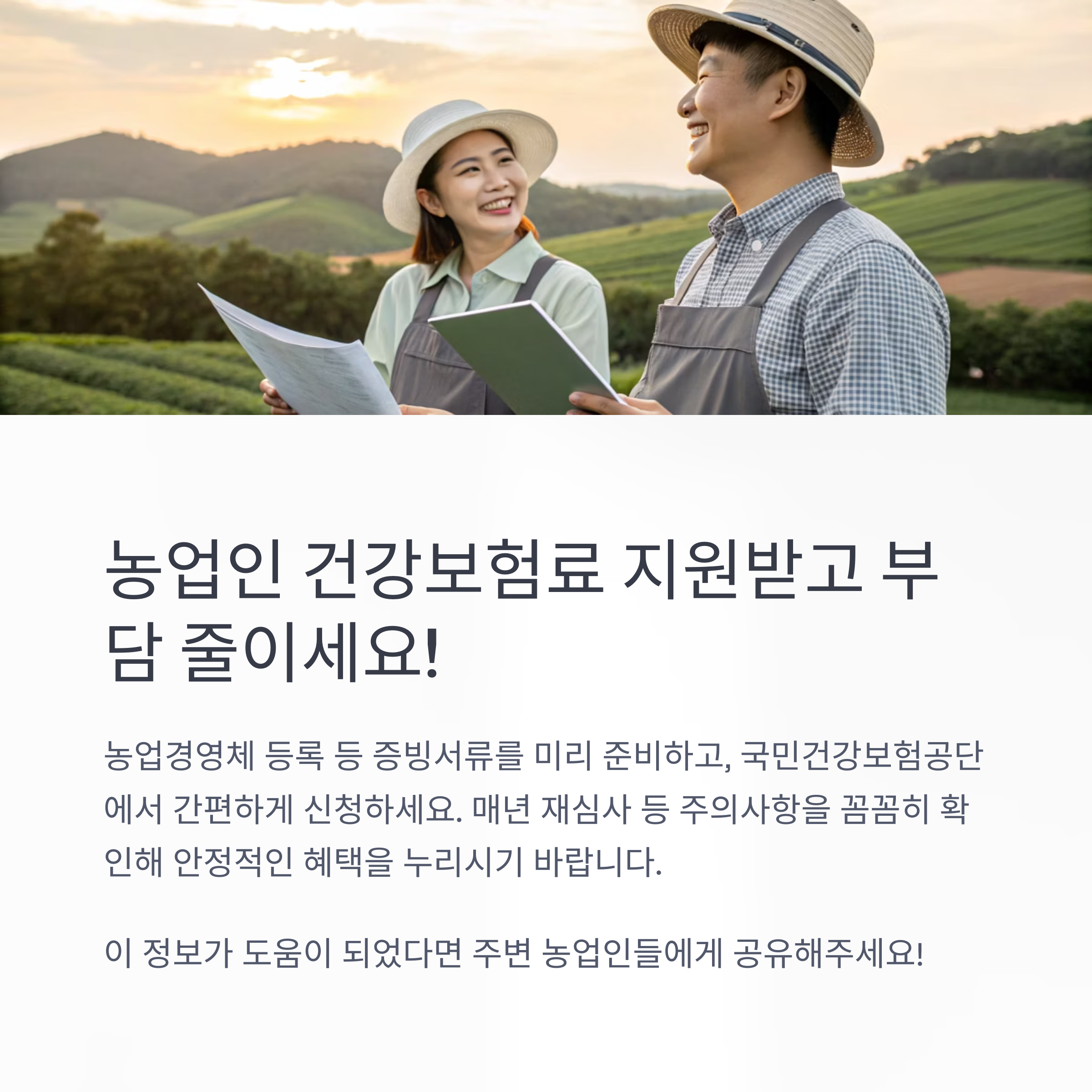 2025년 농업인 건강보험료 지원제도는 농촌 지역 농업인의 경제적 부담을 크게 덜어주는 복지정책입니다. 농업경영체 등록 등 증빙서류를 미리 준비하고, 국민건강보험공단 지사 또는 홈페이지에서 간편하게 신청하세요. 지원 대상 및 자격 요건, 매년 재심사 등 주의사항을 꼼꼼히 확인해 안정적인 혜택을 누리시기 바랍니다.