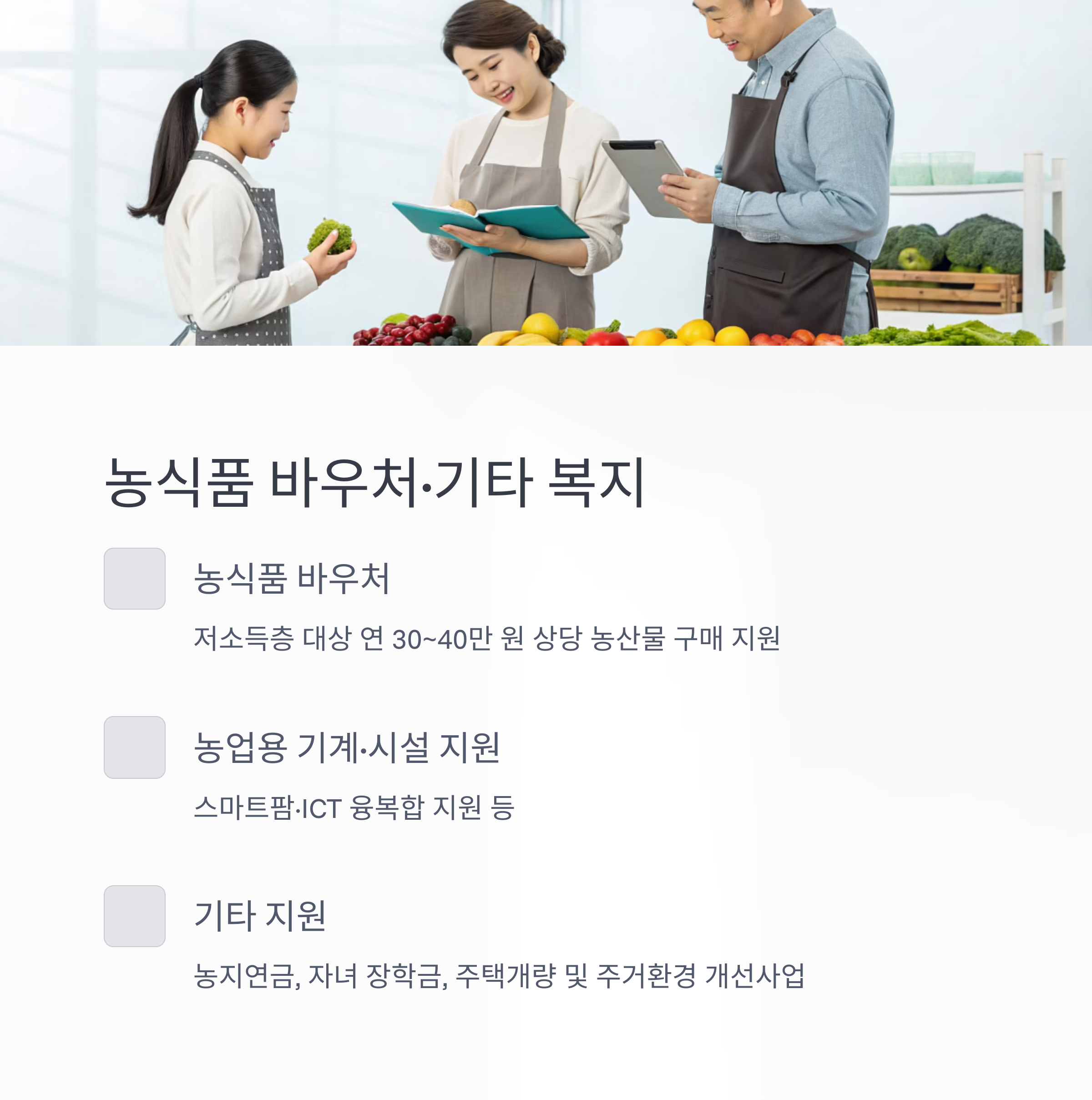 - 농식품 바우처(저소득층): 연 30~40만 원 상당 농산물 구매 지원