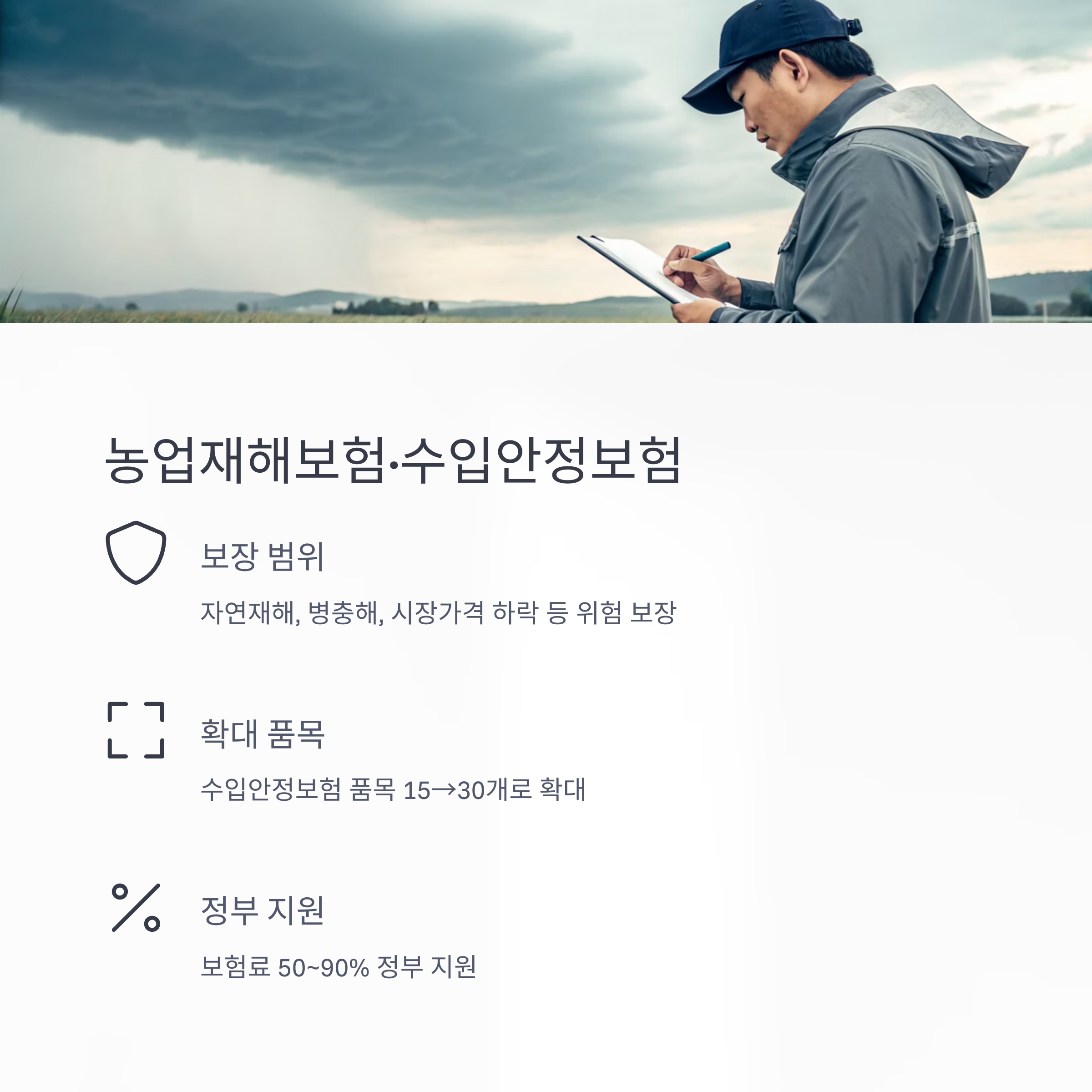 - 자연재해, 병충해, 시장가격 하락 등 위험 보장