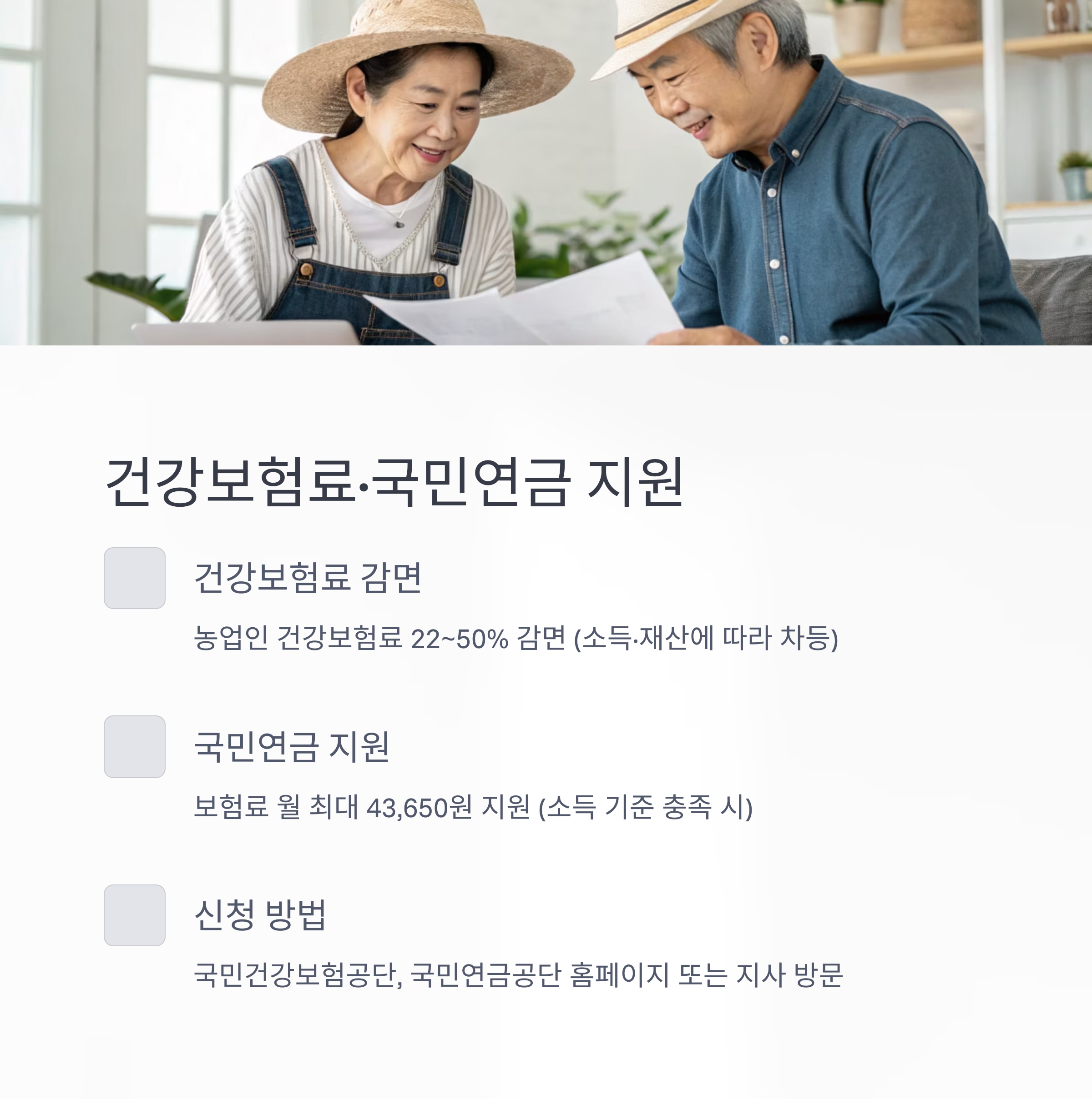 - 농업인 건강보험료 22~50% 감면(소득·재산에 따라 차등)