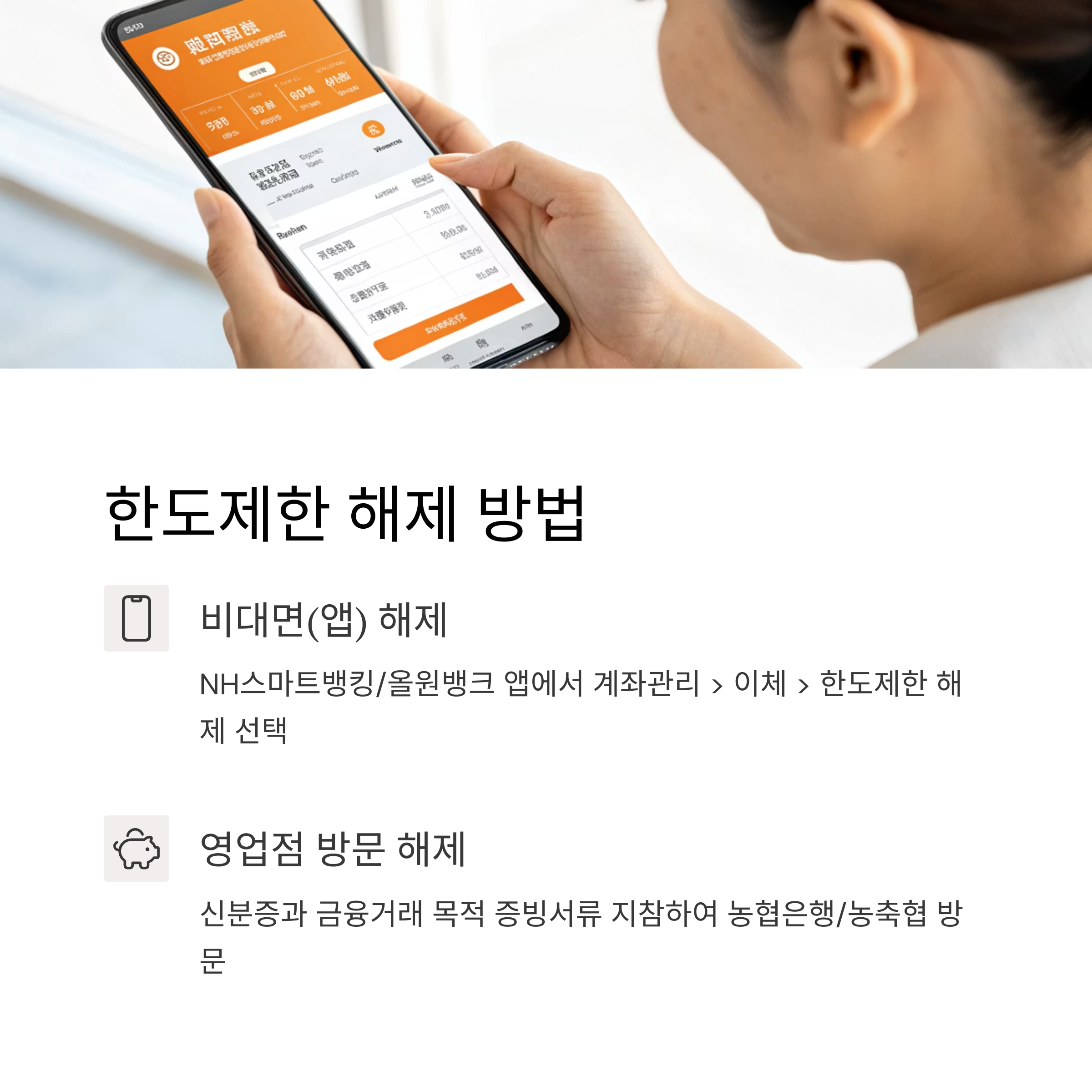 - 농축협 계좌도 스마트뱅킹, NH콕뱅크 앱에서 해제 신청 가능(조건 충족 시 자동 해제)