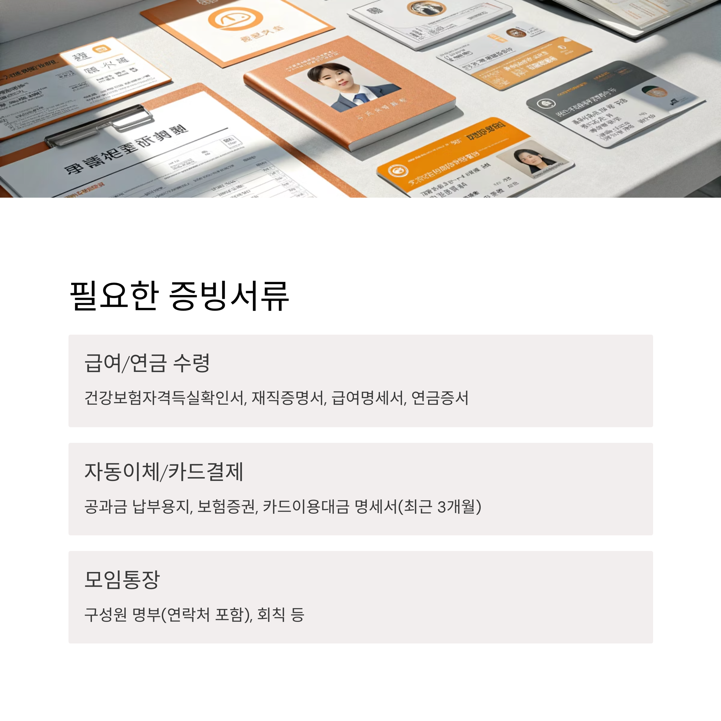 - 급여수령: 건강보험자격득실확인서, 재직증명서, 급여명세서, 사원증, 근로소득원천징수영수증 등