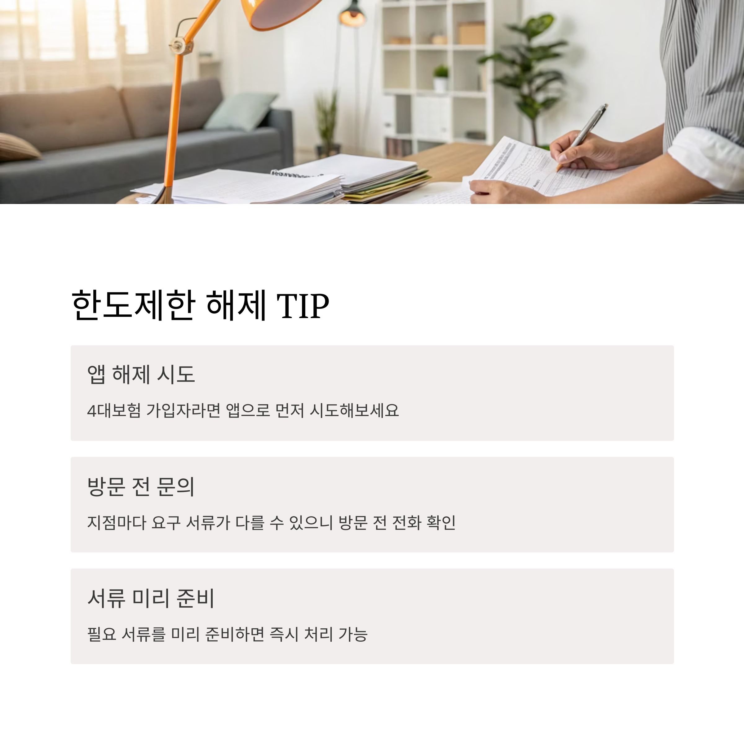 - 직원이 서류 확인 후 한도제한 해제 신청 진행(현장 즉시 처리)