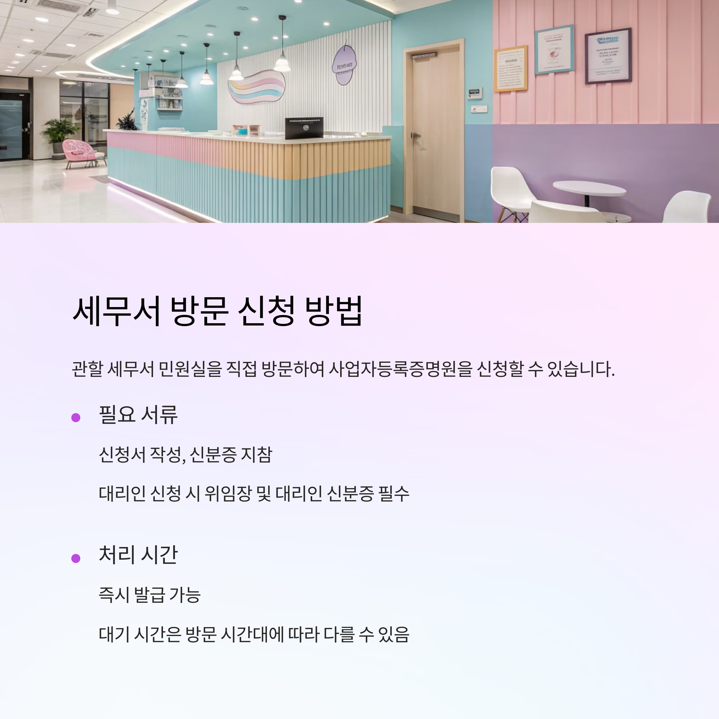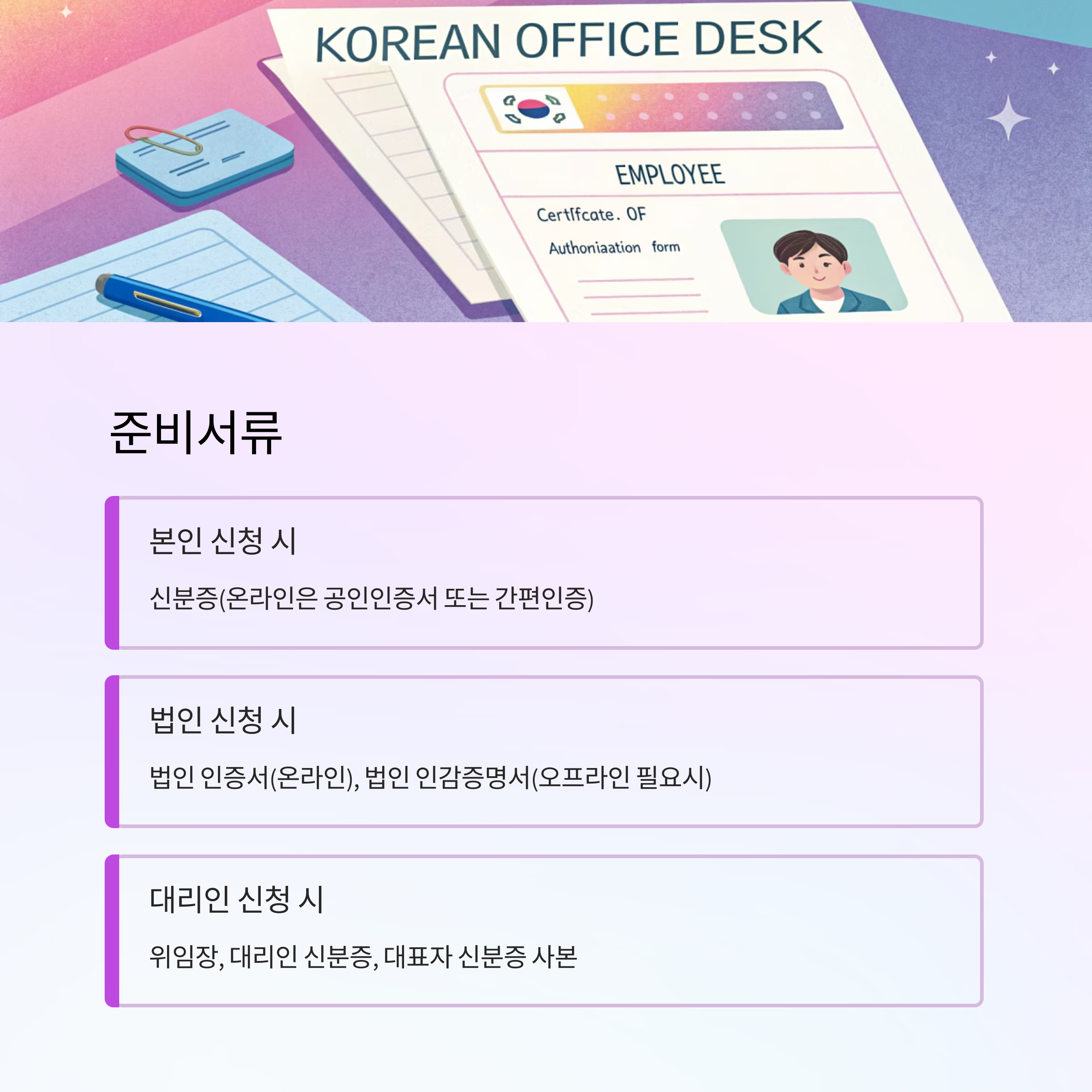 - 대리인 신청: 위임장, 대리인 신분증, 대표자 신분증 사본