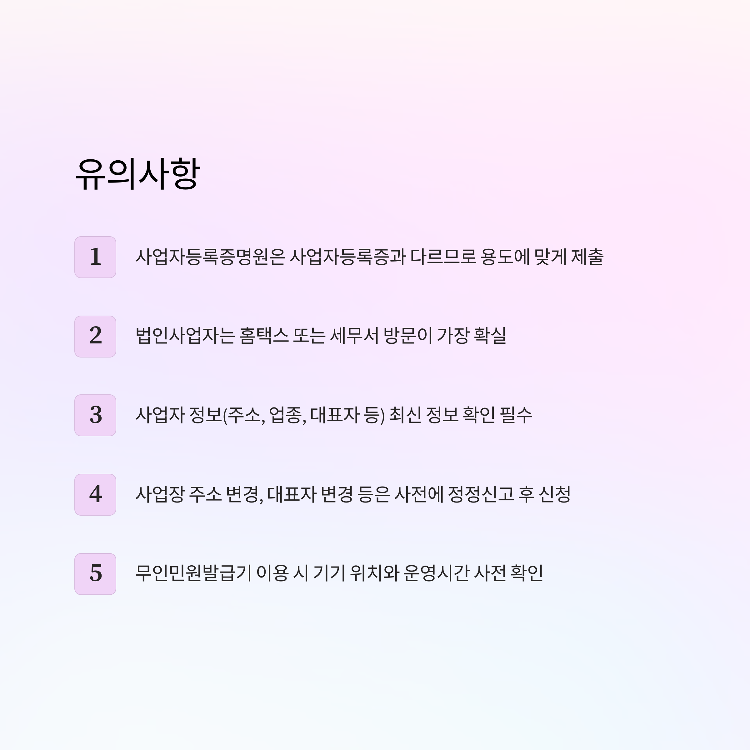 - 사업자 정보(주소, 업종, 대표자 등) 최신 정보 확인 필수