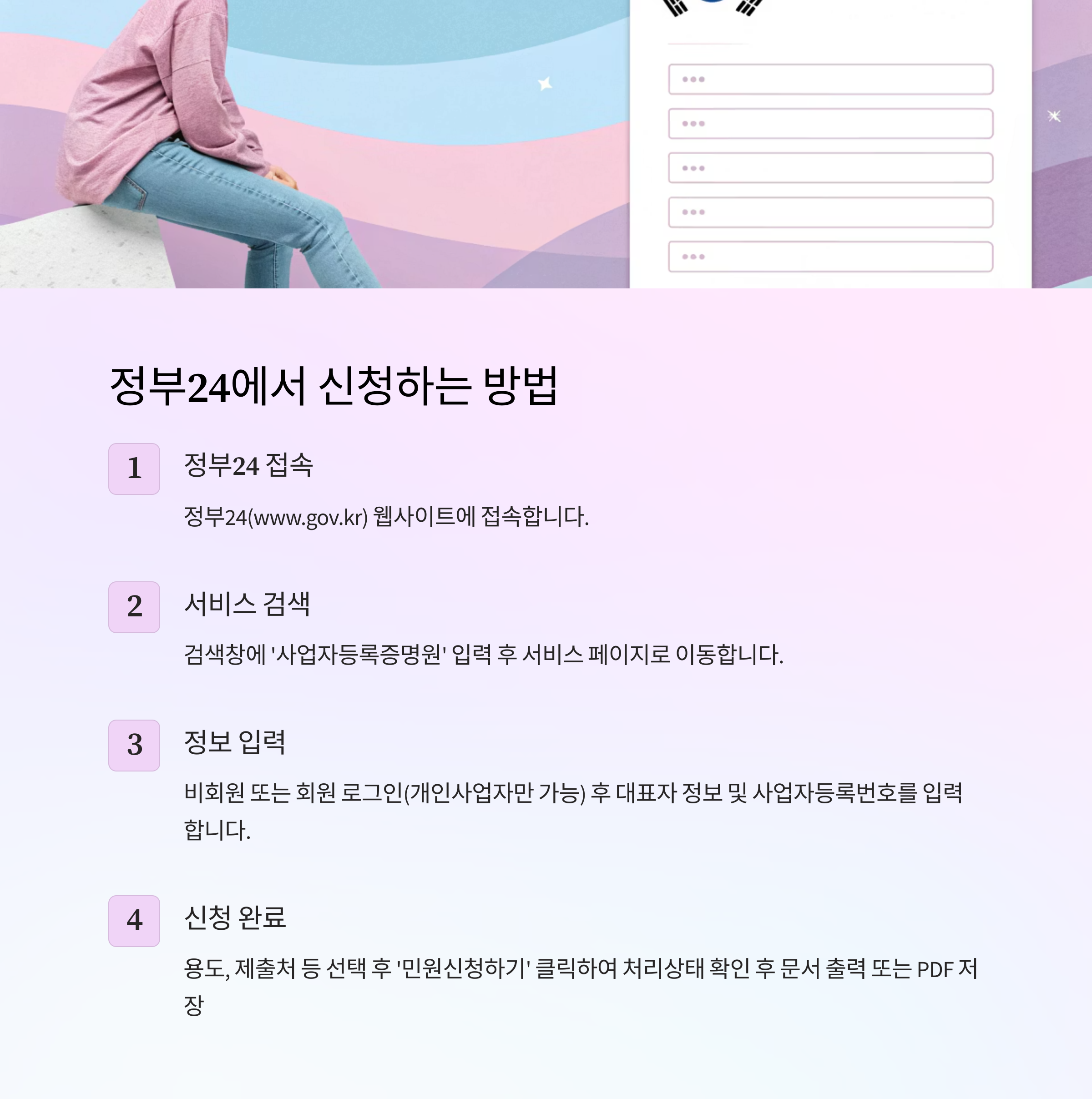 - 정부24(온라인): 개인사업자 비회원도 신청 가능, 법인은 제한