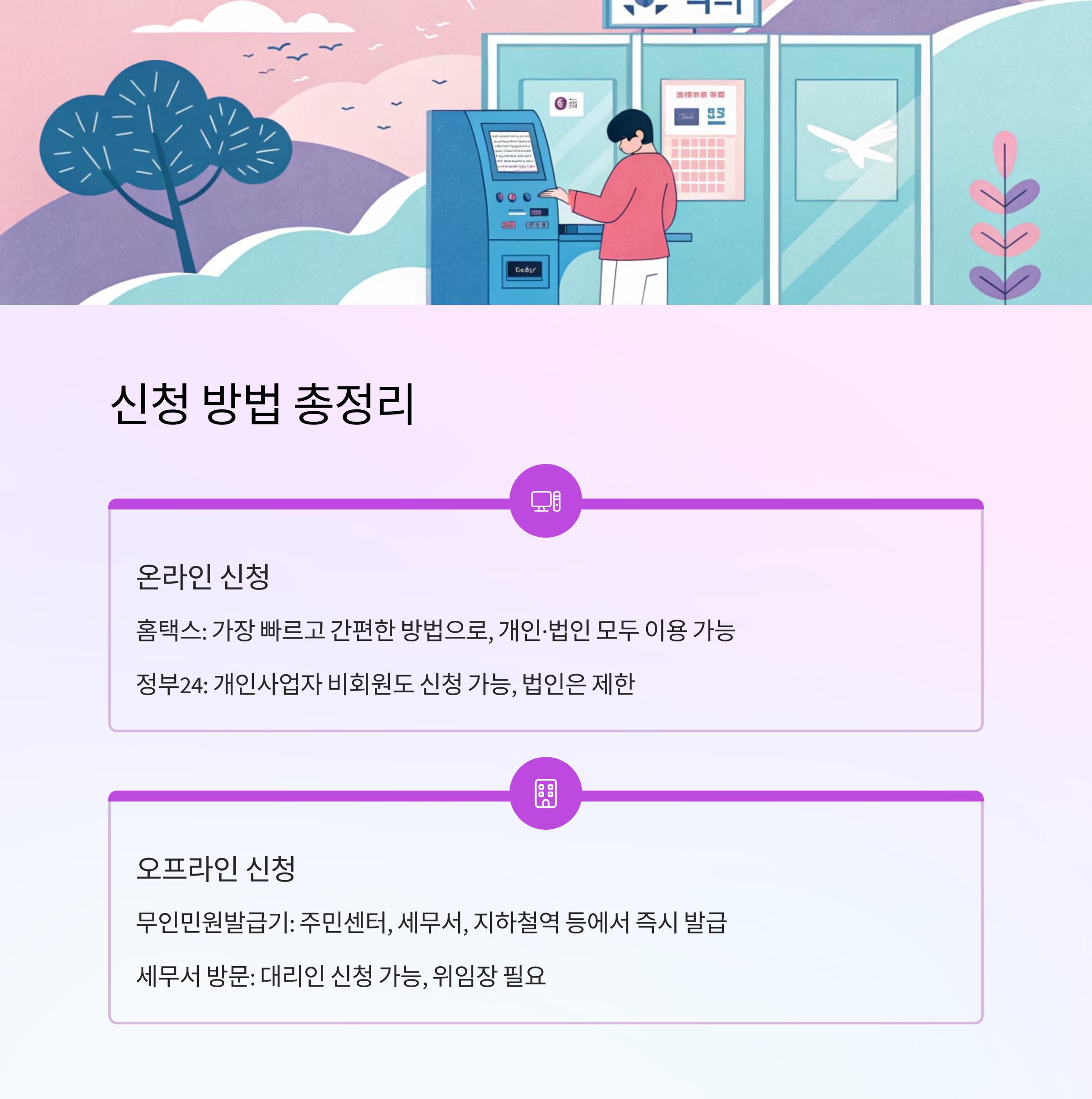 - 무인민원발급기(오프라인): 주민센터, 세무서, 지하철역 등에서 즉시 발급
