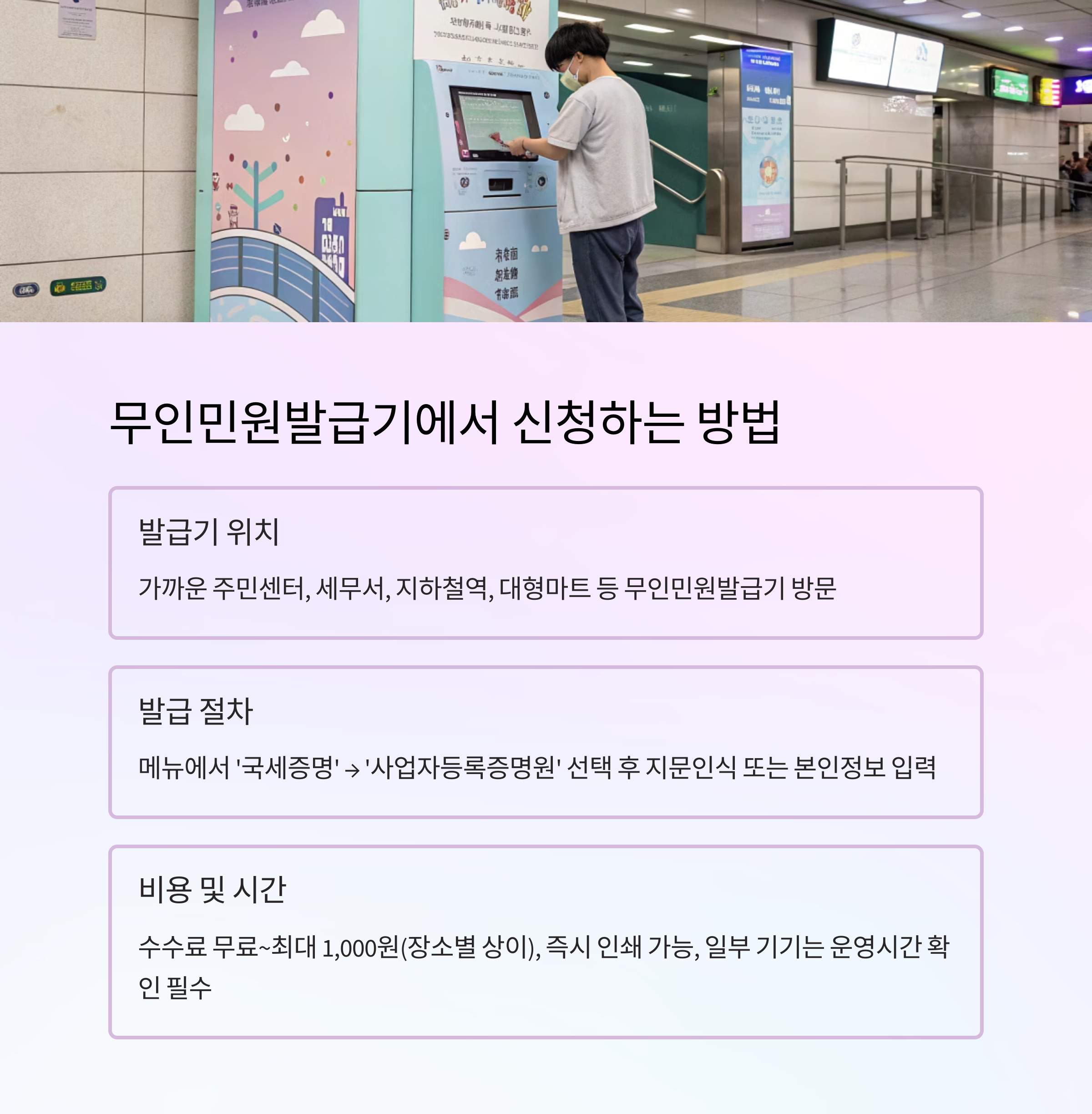 - 가까운 주민센터, 세무서, 지하철역, 대형마트 등 무인민원발급기 방문