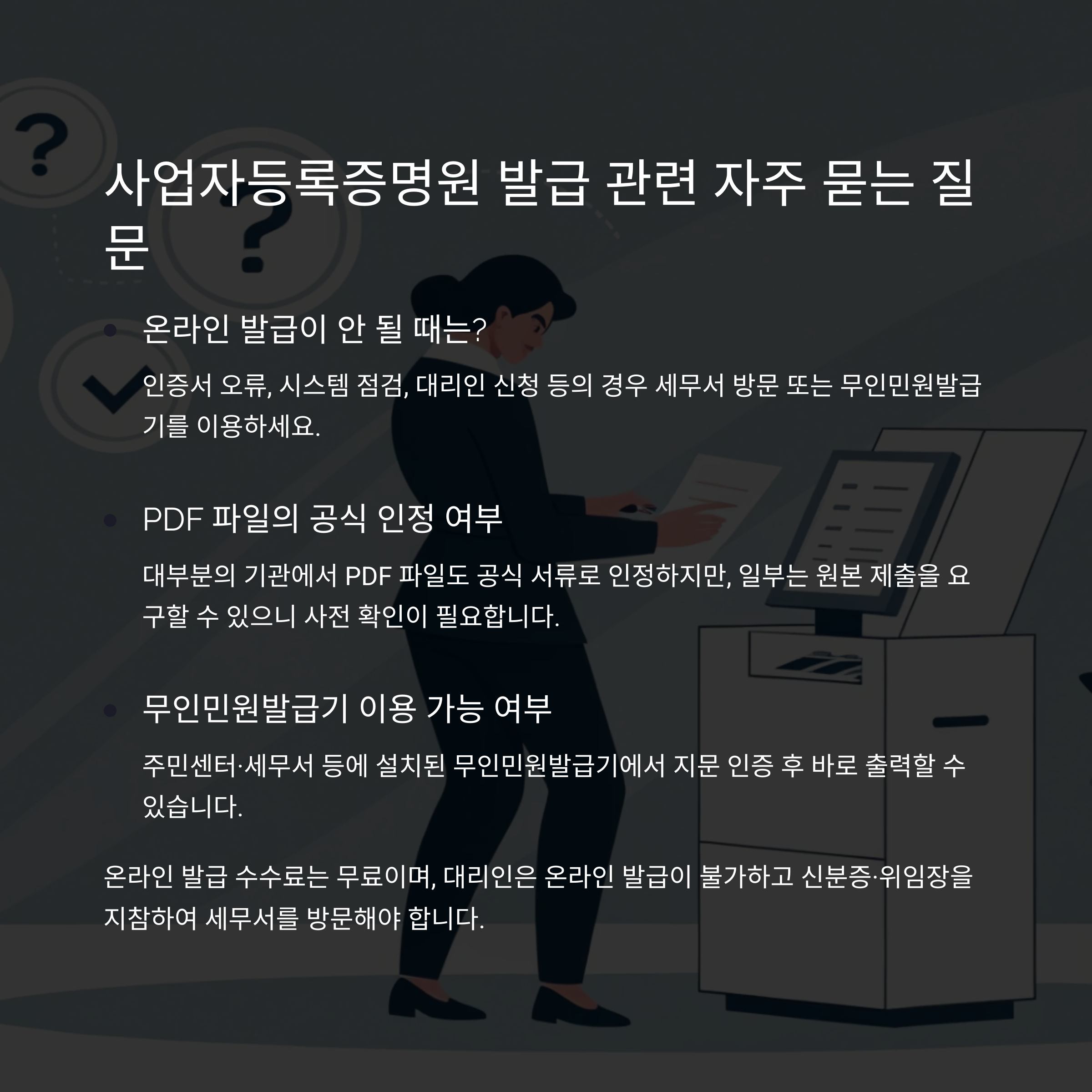 A. 인증서 오류, 시스템 점검, 대리인 신청 등은 세무서 방문 또는 무인민원발급기를 이용하세요. - Q. PDF 파일로 저장해도 공식 서류로 인정되나요?