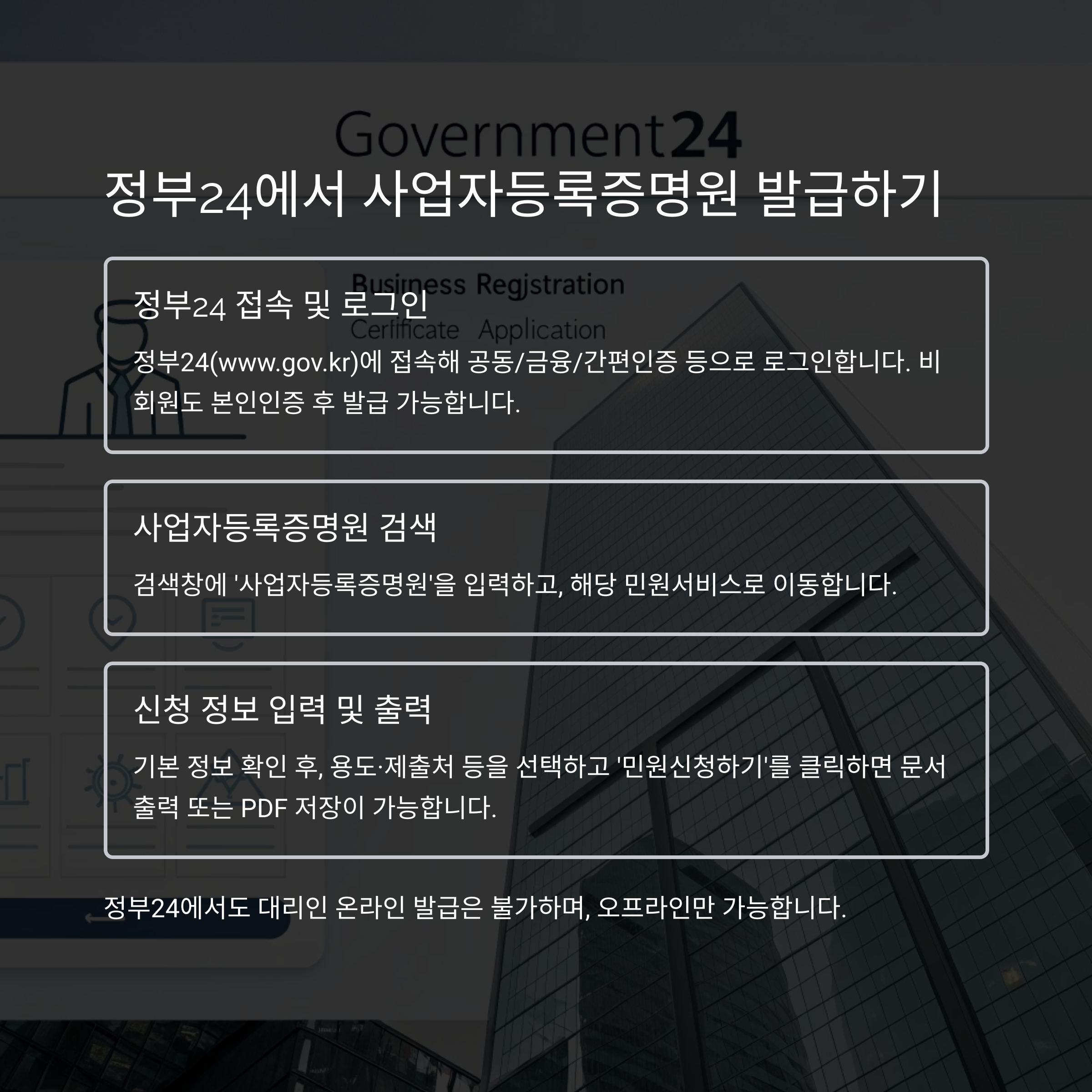 - 오프라인 발급(세무서, 무인민원발급기)은 신분증, 위임장 등 추가 서류 필요