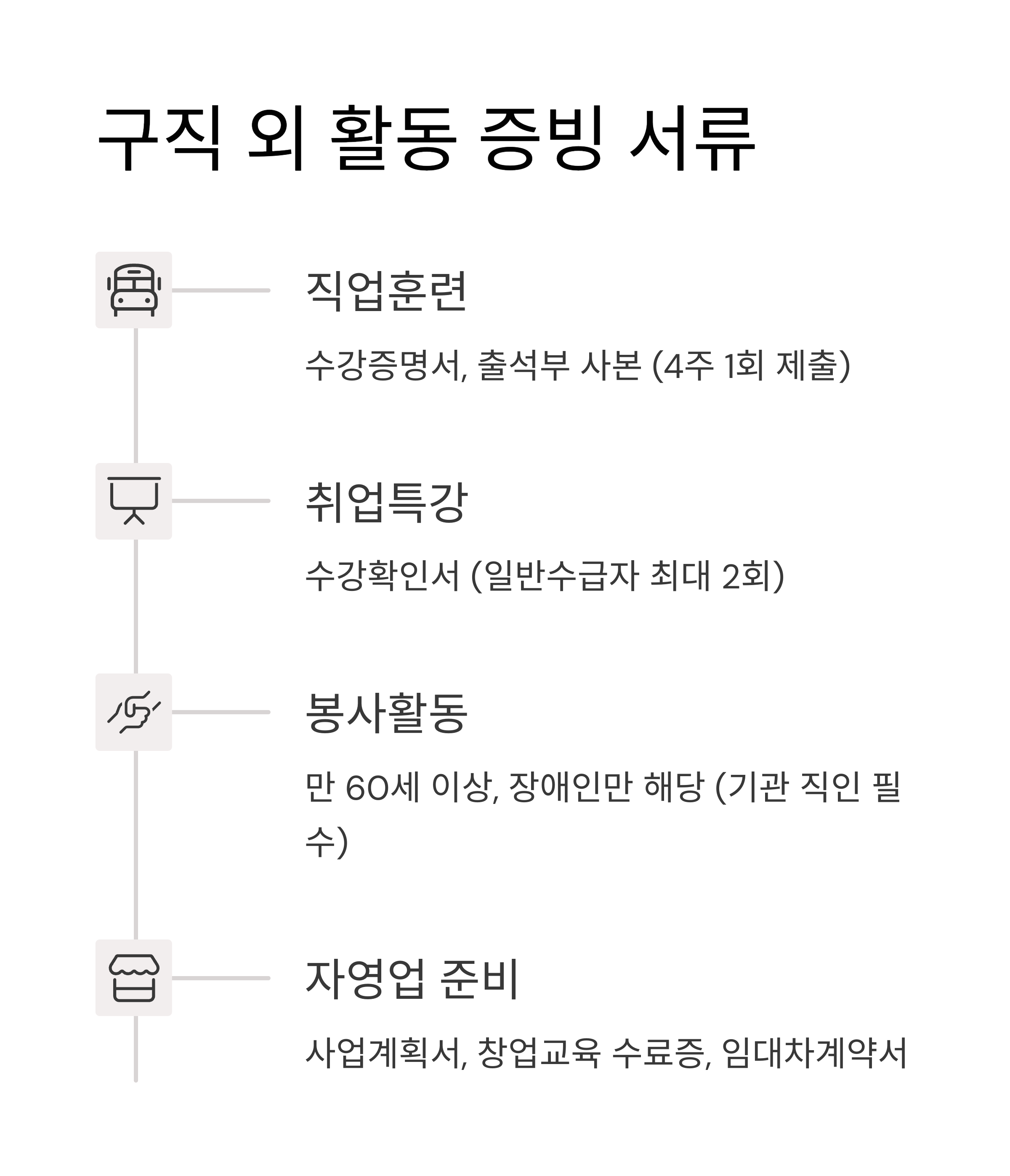 - 자영업 준비 : 사업계획서, 시장조사보고서, 창업교육 수료증, 임대차계약서, 관공서 방문 기록 등