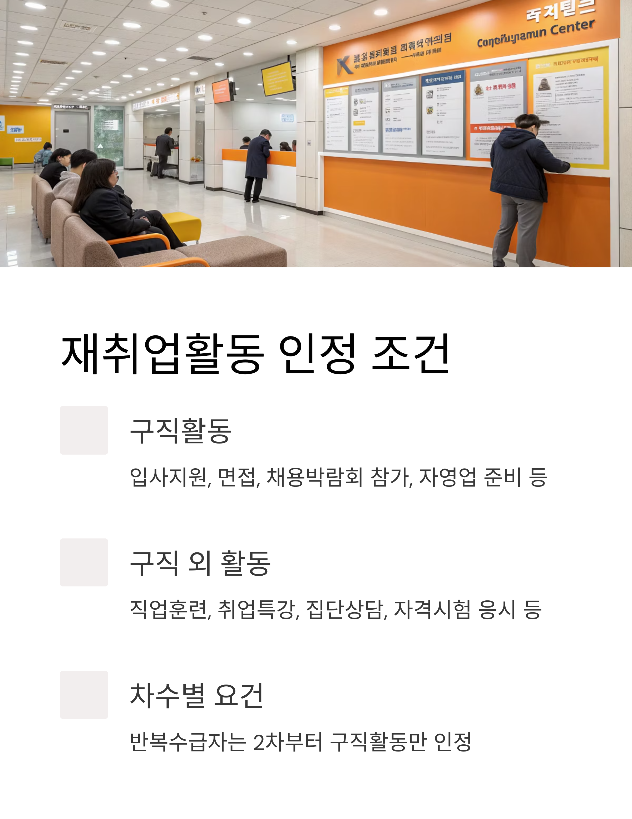 - 반복수급자(5년 내 3회 이상)는 2차부터 구직활동만 인정, 장기수급자는 5차부터 구직활동 1회 필수, 8차부터 구직활동만 인정