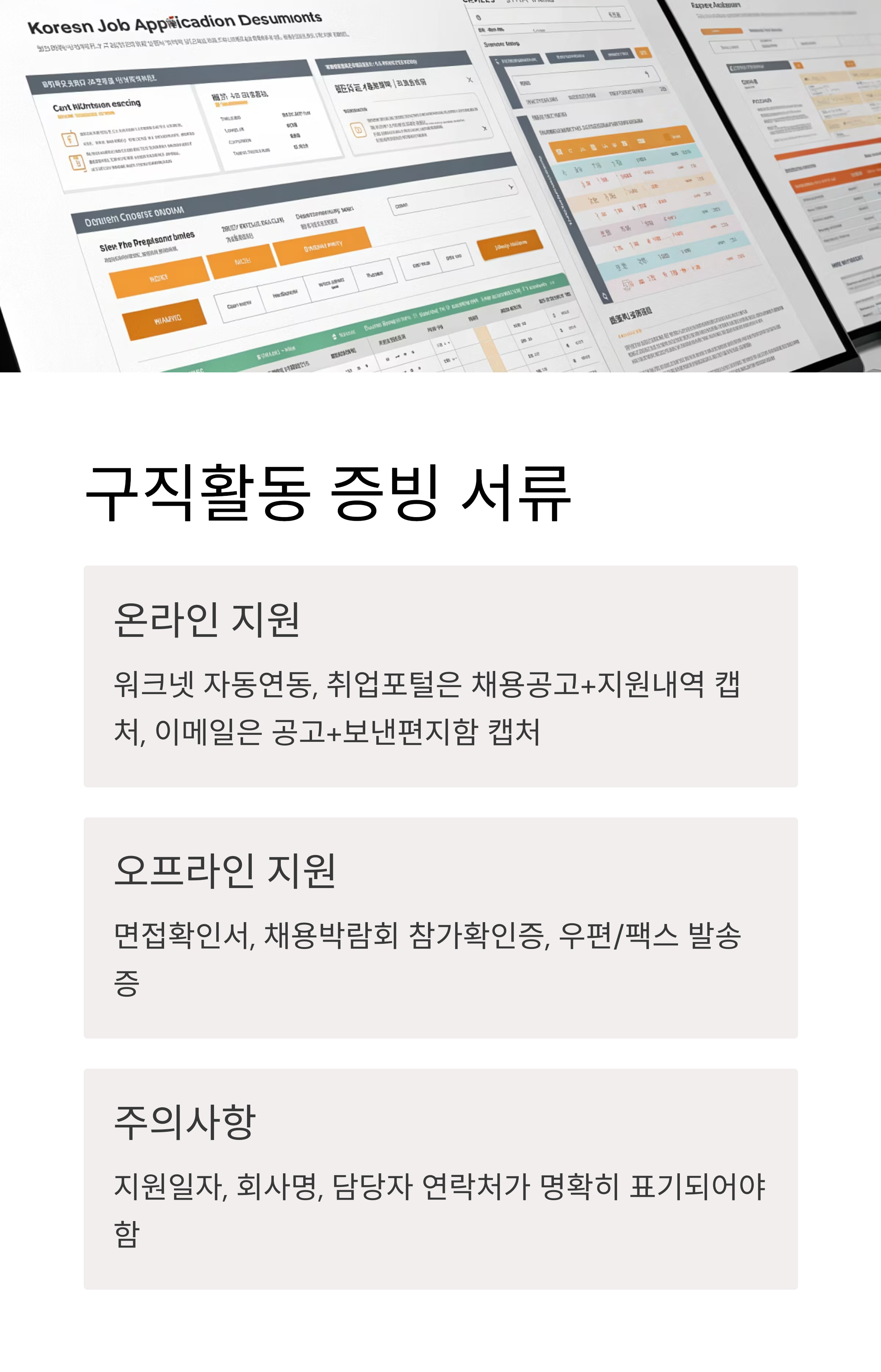 ※ 모든 증빙자료는 지원일자, 회사명, 담당자 연락처, 지원 내역 등이 명확히 드러나야 하며, 허위 제출 시 실업급여 지급이 중단될 수 있습니다.