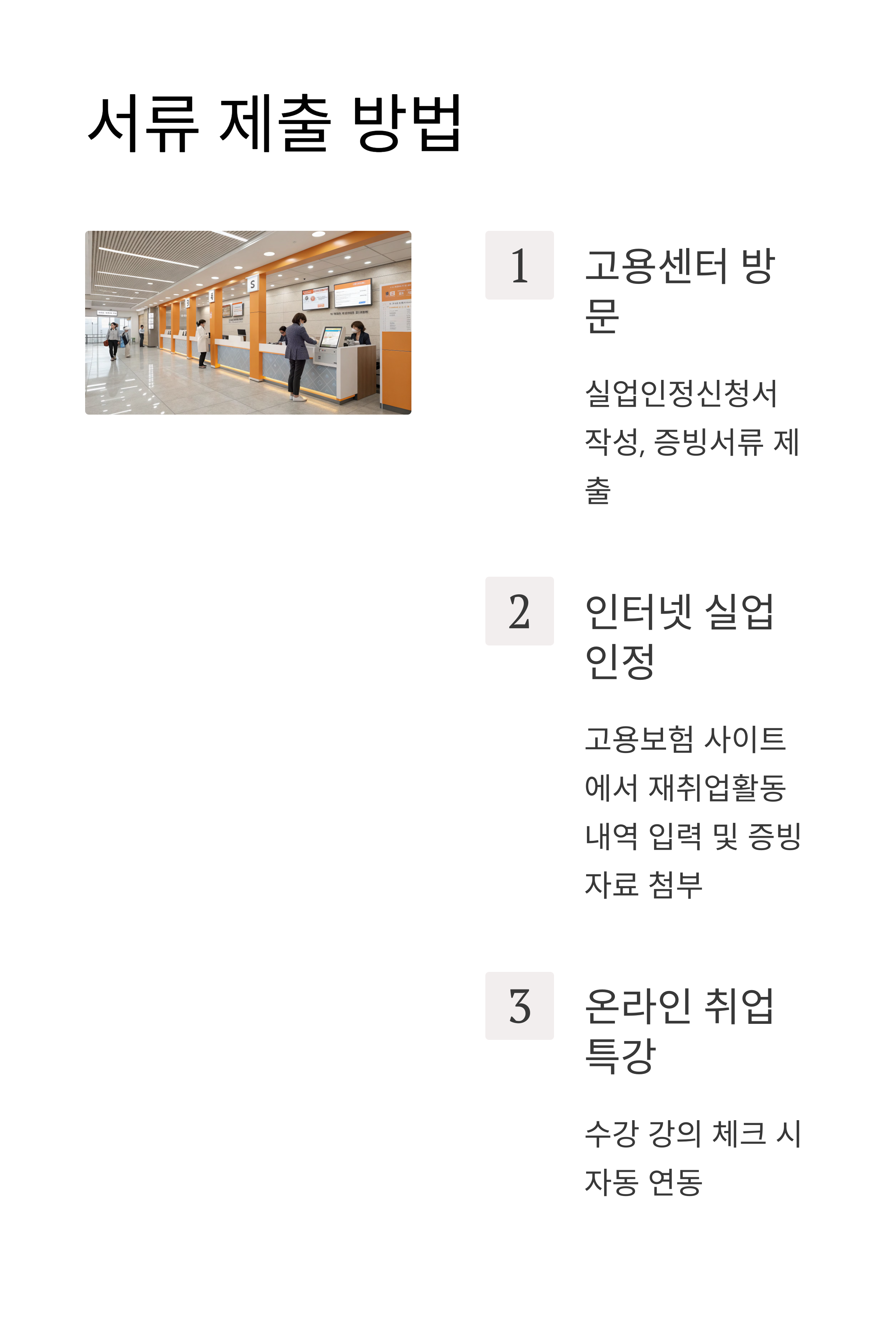 - 고용센터 방문 : 실업인정신청서(센터 비치) 작성, 구직/구직 외 활동 증빙서류 제출
