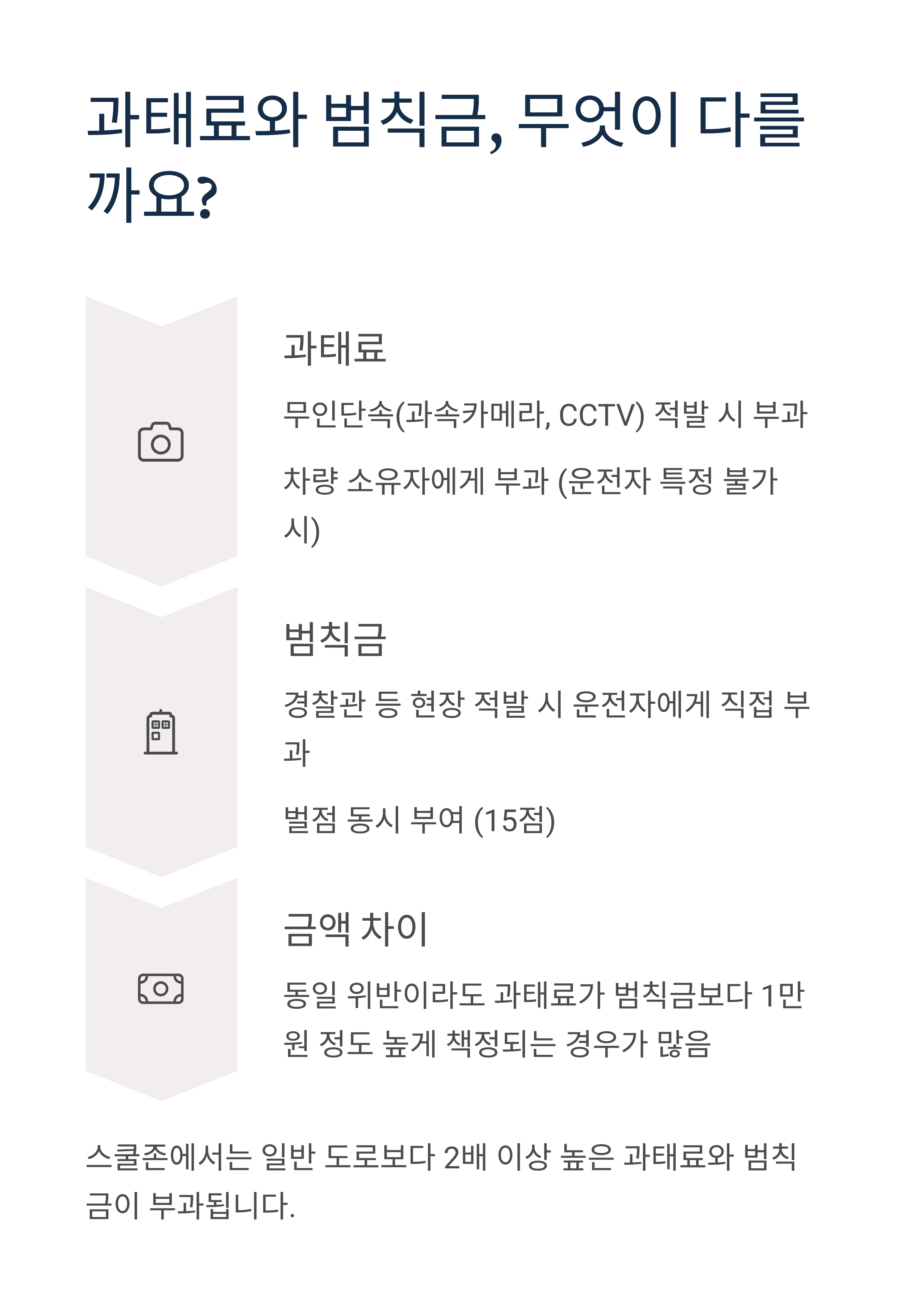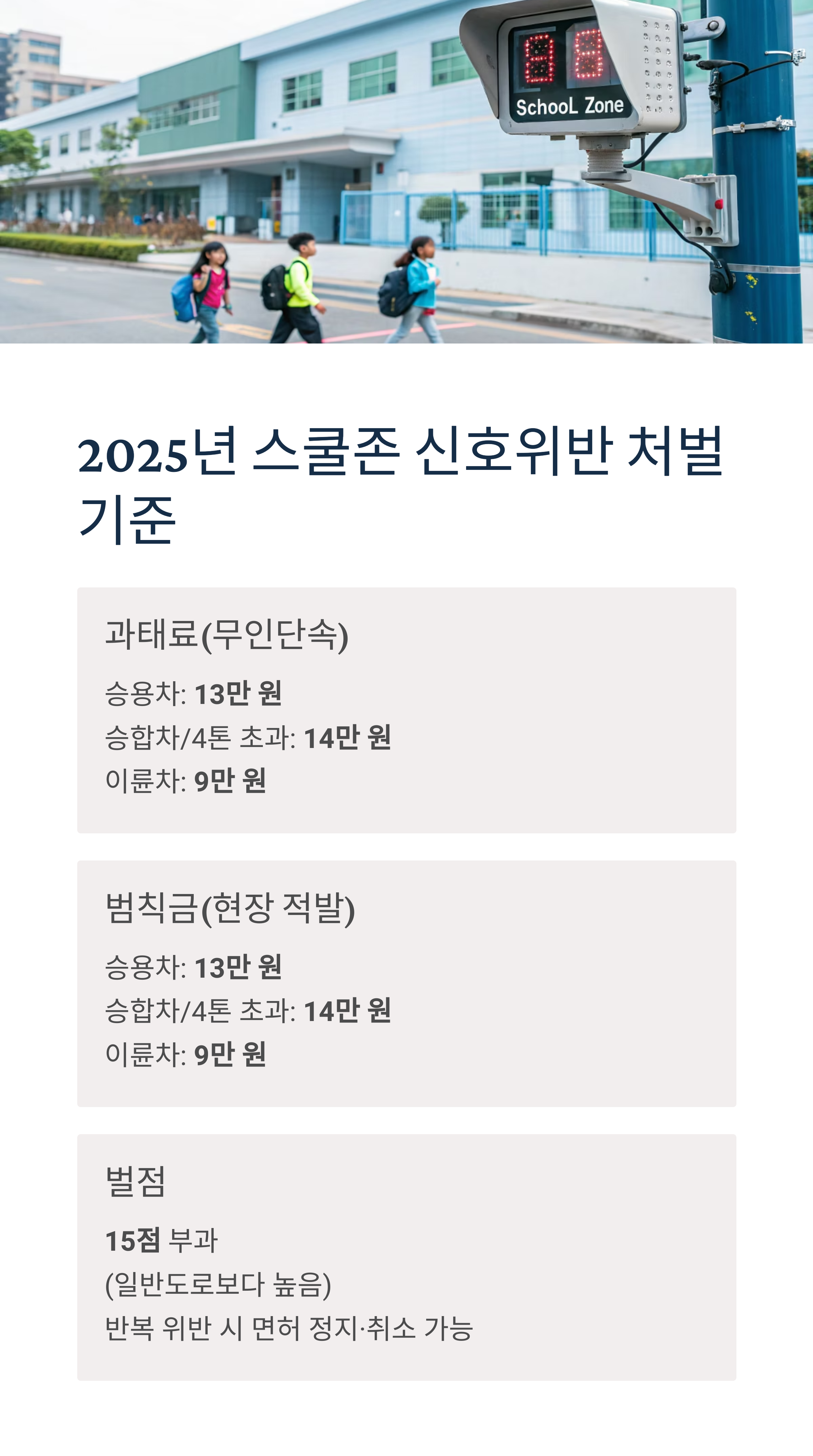 2025년 기준 승용차는 일반 도로 6~8만 원에서 스쿨존 13만 원으로 2배 이상 인상되었습니다.